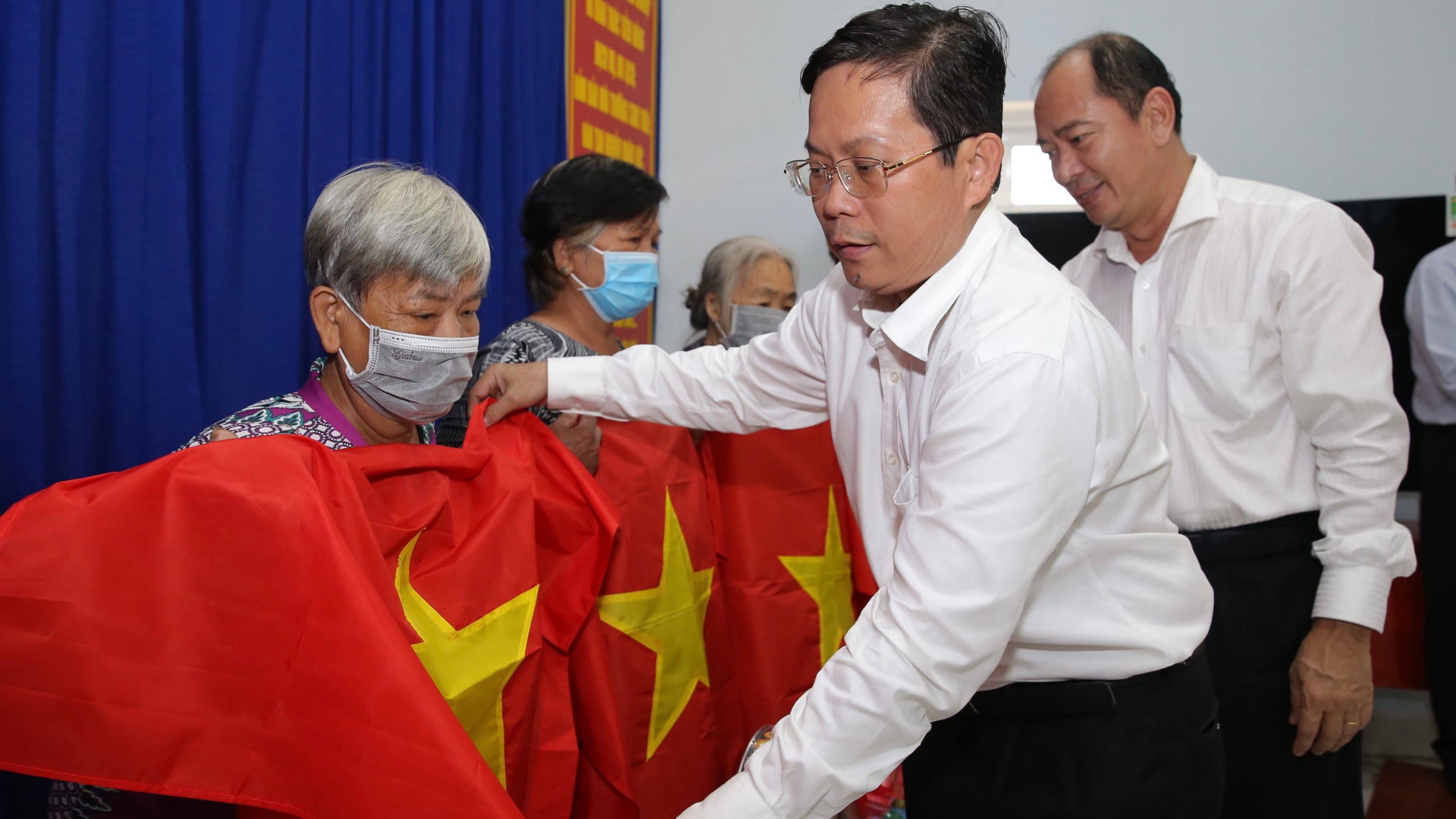 Ông Tô Đình Tuân, Tổng Biên tập Báo Người Lao Động trao cờ Tổ quốc và túi thuốc cho người dân xã đảo Thạnh An, huyện Cần Giờ.