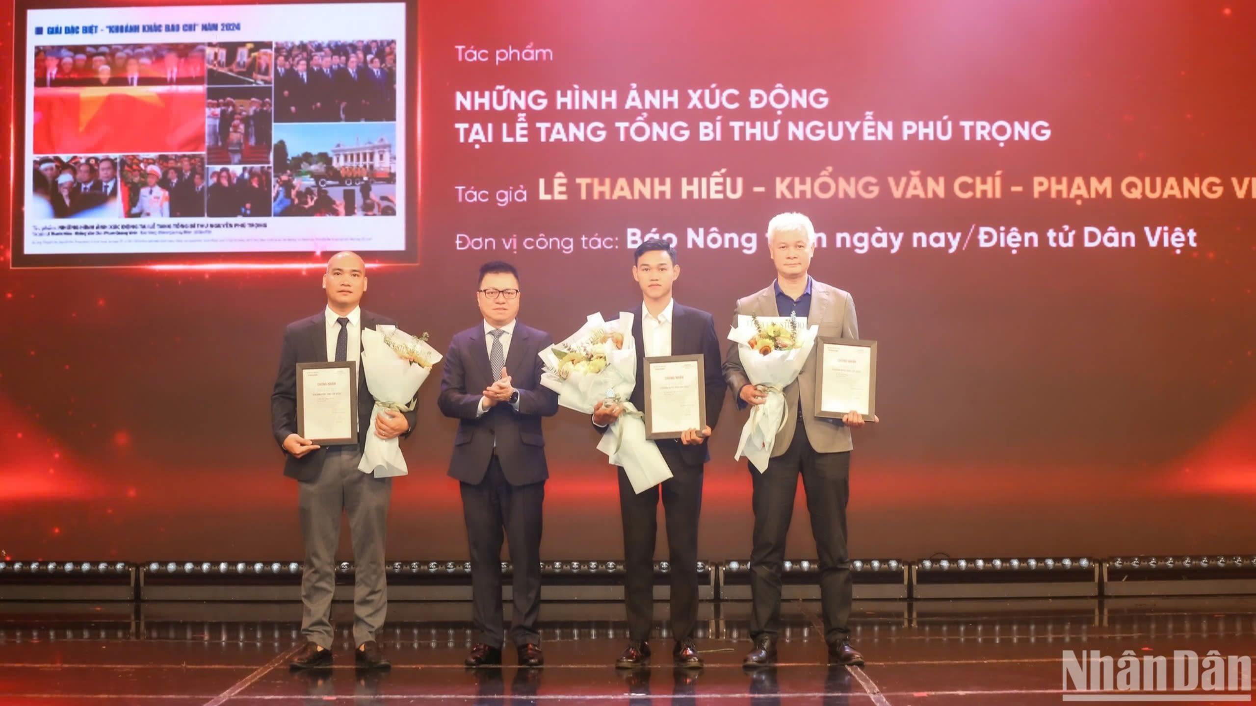 Đồng chí Lê Quốc Minh trao giải Đặc biệt cho nhóm tác giả đoạt giải Cuộc thi ảnh "Khoảnh khắc báo chí" năm 2024.