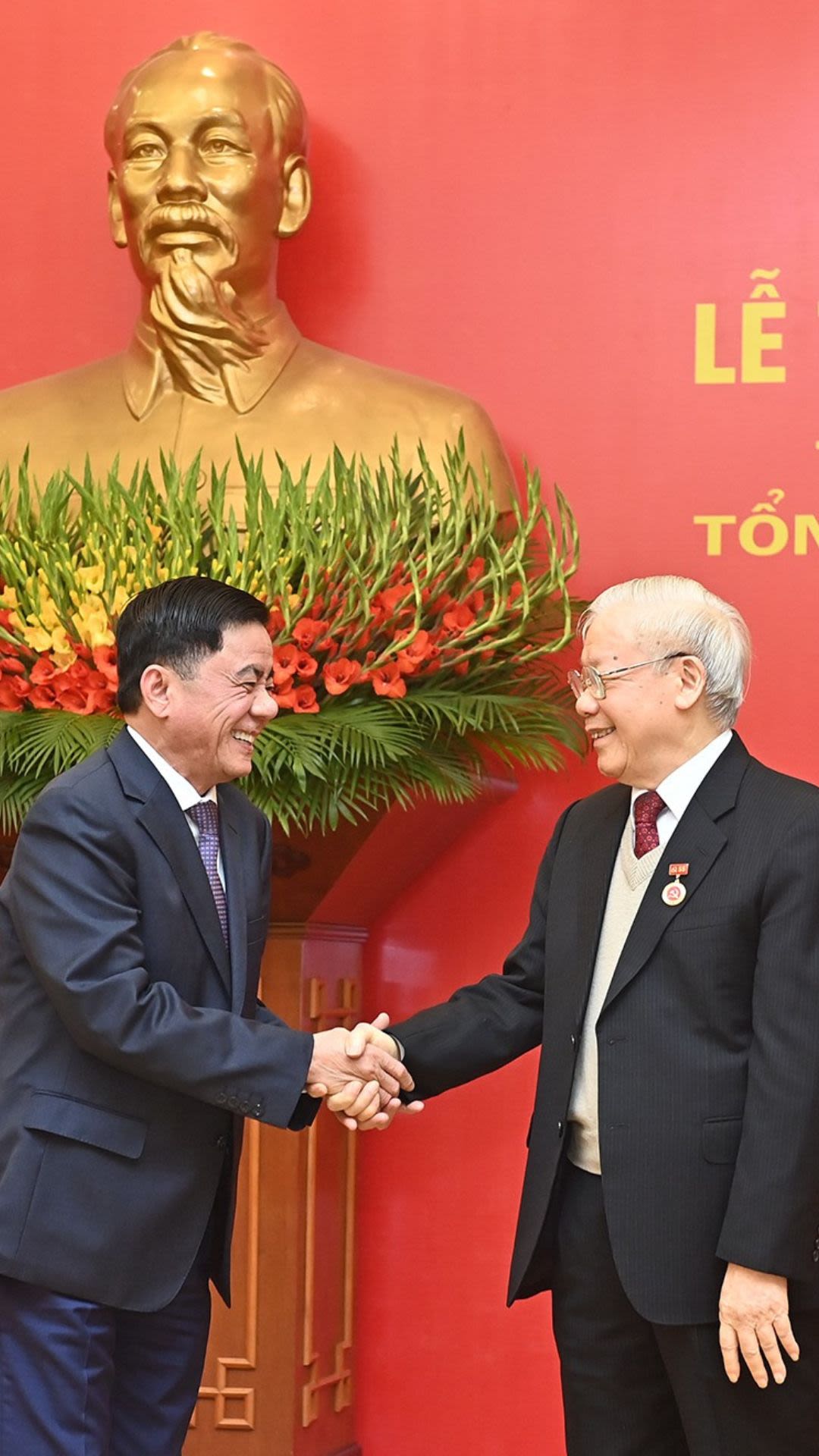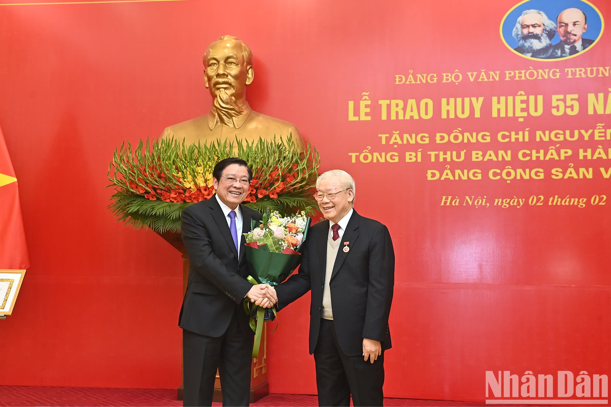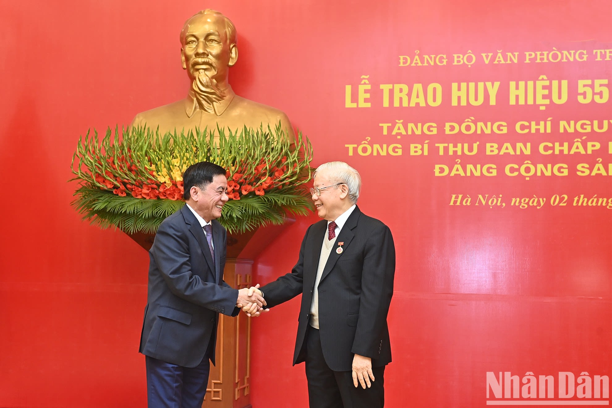 Đồng chí Võ Văn Thưởng, Ủy viên Bộ Chính trị, Thường trực Ban Bí thư trao Huy hiệu 55 năm tuổi Đảng tặng Tổng Bí thư Nguyễn Phú Trọng.