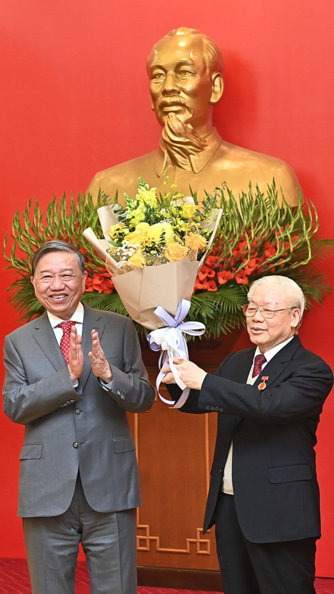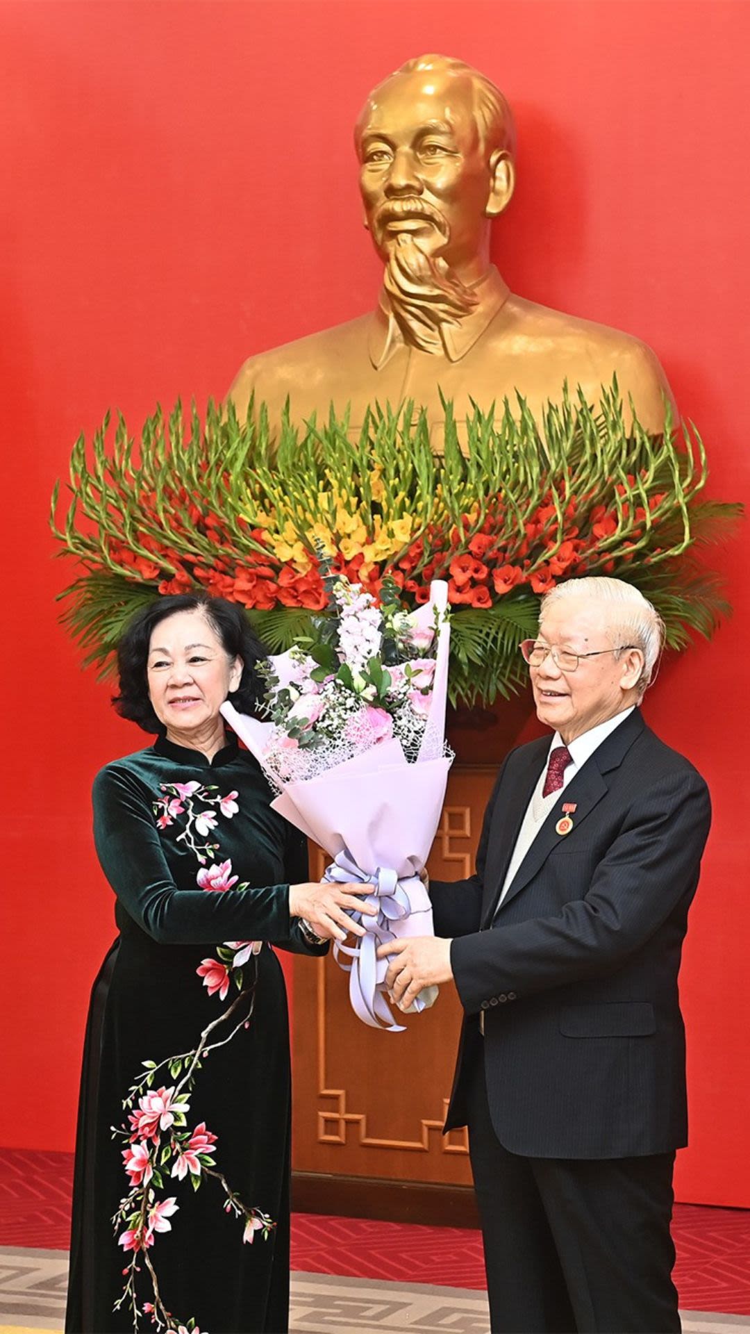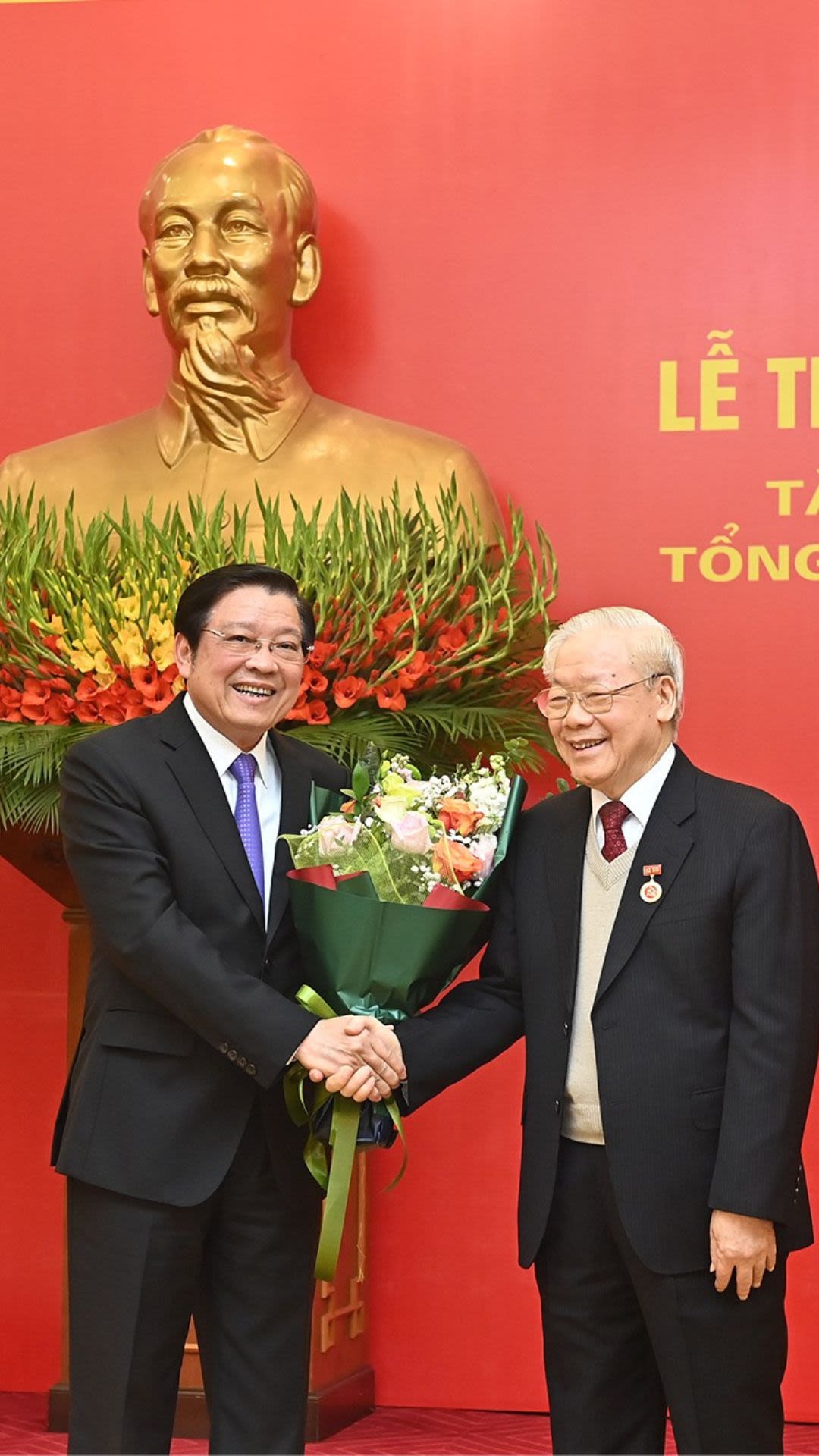 Đồng chí Võ Văn Thưởng, Ủy viên Bộ Chính trị, Thường trực Ban Bí thư trao Huy hiệu 55 năm tuổi Đảng tặng Tổng Bí thư Nguyễn Phú Trọng.