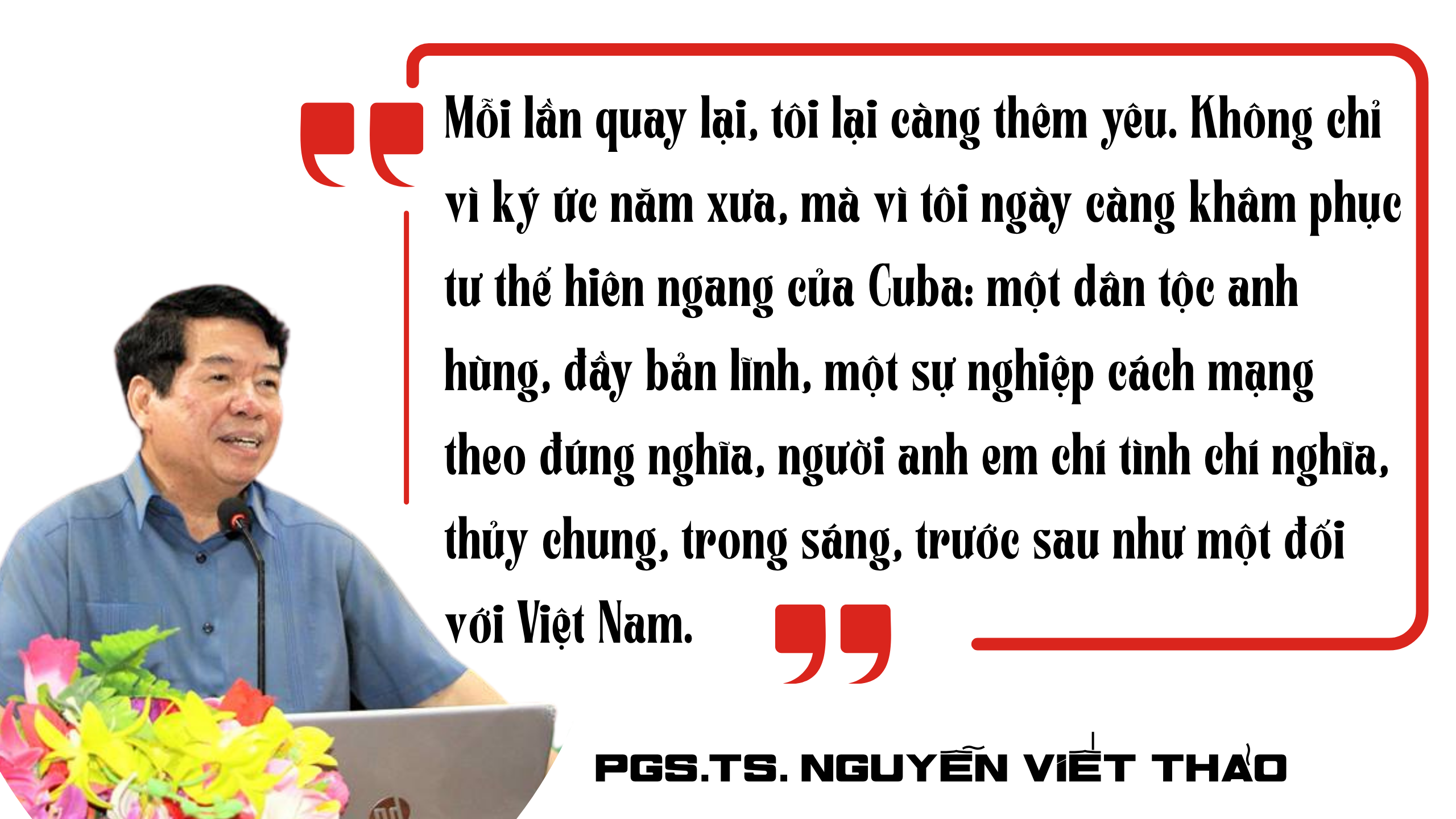 Gặp ông hôm ấy, tôi không chỉ được nghe chuyện của một sinh viên từng học tập tại Cuba, mà còn được đồng hành trong một dòng chảy ký ức - nơi kỷ niệm cá nhân hòa vào mạch sống của mối quan hệ Việt Nam-Cuba nghĩa tình, son sắt. Đối với PGS.TS Nguyễn Viết Thảo, người thầy tận tụy của nhiều thế hệ học viên là cán bộ lãnh đạo, quản lý chủ chốt của đất nước, Cuba vẫn luôn là miền ký ức thiêng liêng, là nơi ông đã sống, đã học tập, đã yêu thương và trưởng thành. Từ mảnh đất ấy, ông mang về không chỉ tri thức chính trị-lý luận, mà còn mang theo một phần tâm hồn thấm đẫm tình nghĩa quốc tế, tinh thần nhân văn sâu sắc và trách nhiệm với cộng đồng, với đất nước. Và trong sâu thẳm, Cuba vẫn luôn là một phần máu thịt trong hành trình tri thức và nhân cách, giống như câu ông vẫn thường nói đầy tự hào: “Trong tôi: một nửa Việt Nam, một nửa Cuba”.
