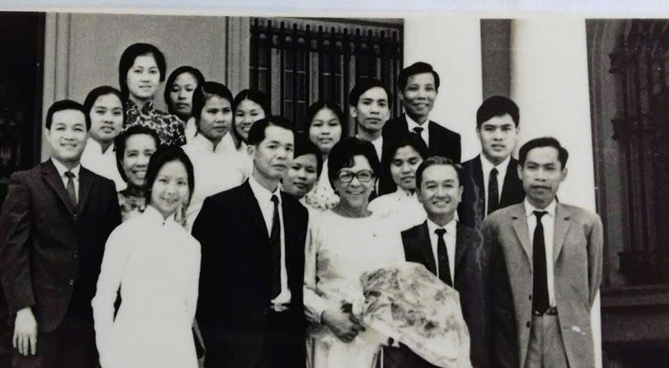 Bà Lương Kim Thái (đầu tiên bên trái) và bạn bà, ông Đinh Quang Hưng, đến thăm nhà giáo viên, khoảng năm 1968-1969-1970. (Ảnh: Nhân vật cung cấp)