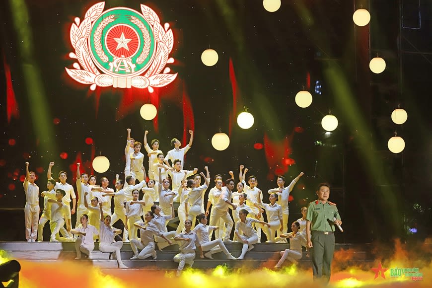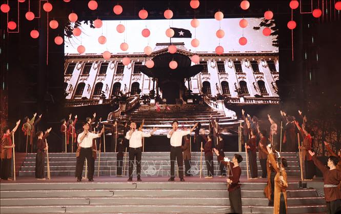Liên khúc "Lá cờ tháng tám" do các nghệ sĩ Minh Sang, Thành Tâm và Đăng Quân biểu diễn. Ảnh: TTXVN