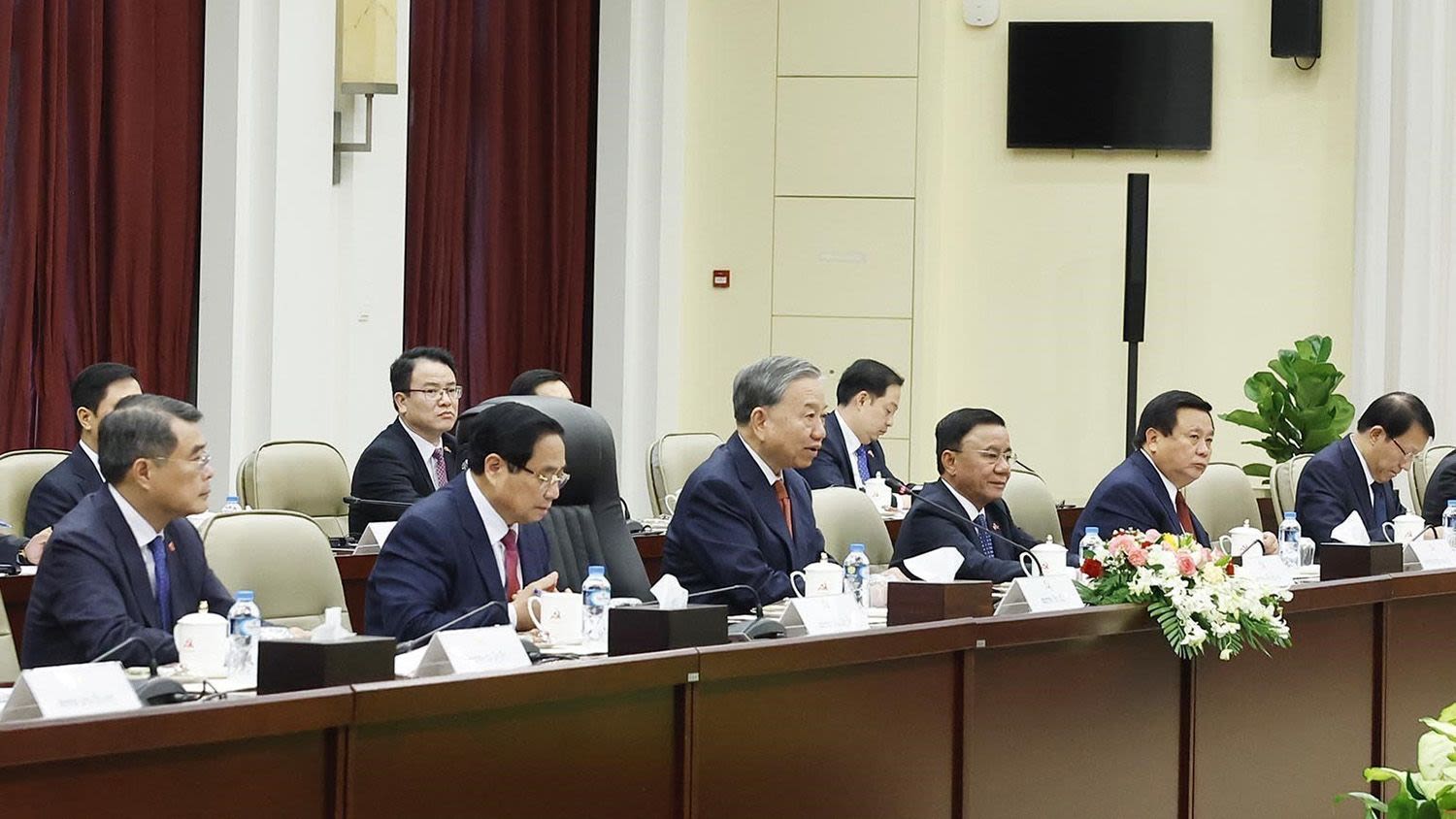 Генеральный секретарь ЦК КПВ То Лам и Генеральный секретарь ЦК НРПЛ, Президент Лаоса Тхонглун Сисулит сопредседательствуют на встрече высокого уровня между КПВ и НРПЛ. Фото: ВИА