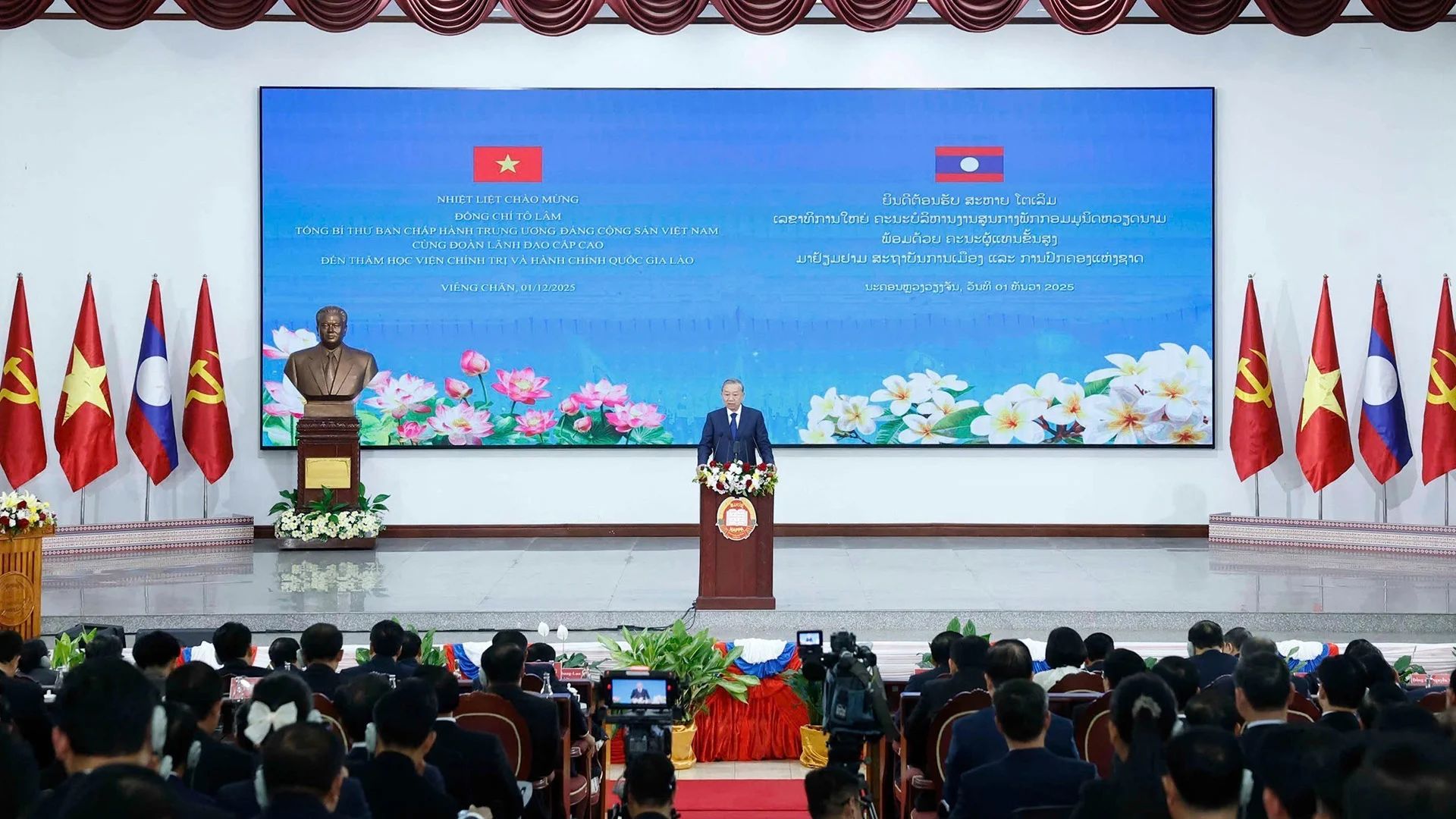Посетив Национальную академию политики и государственного управления Лаоса, товарищ То Лам выступил с политической речью на тему: «Наследовать великую дружбу, укреплять особую солидарность, развивать всеобъемлющее сотрудничество и усиливать стратегическую связанность между Вьетнамом и Лаосом в новый период».