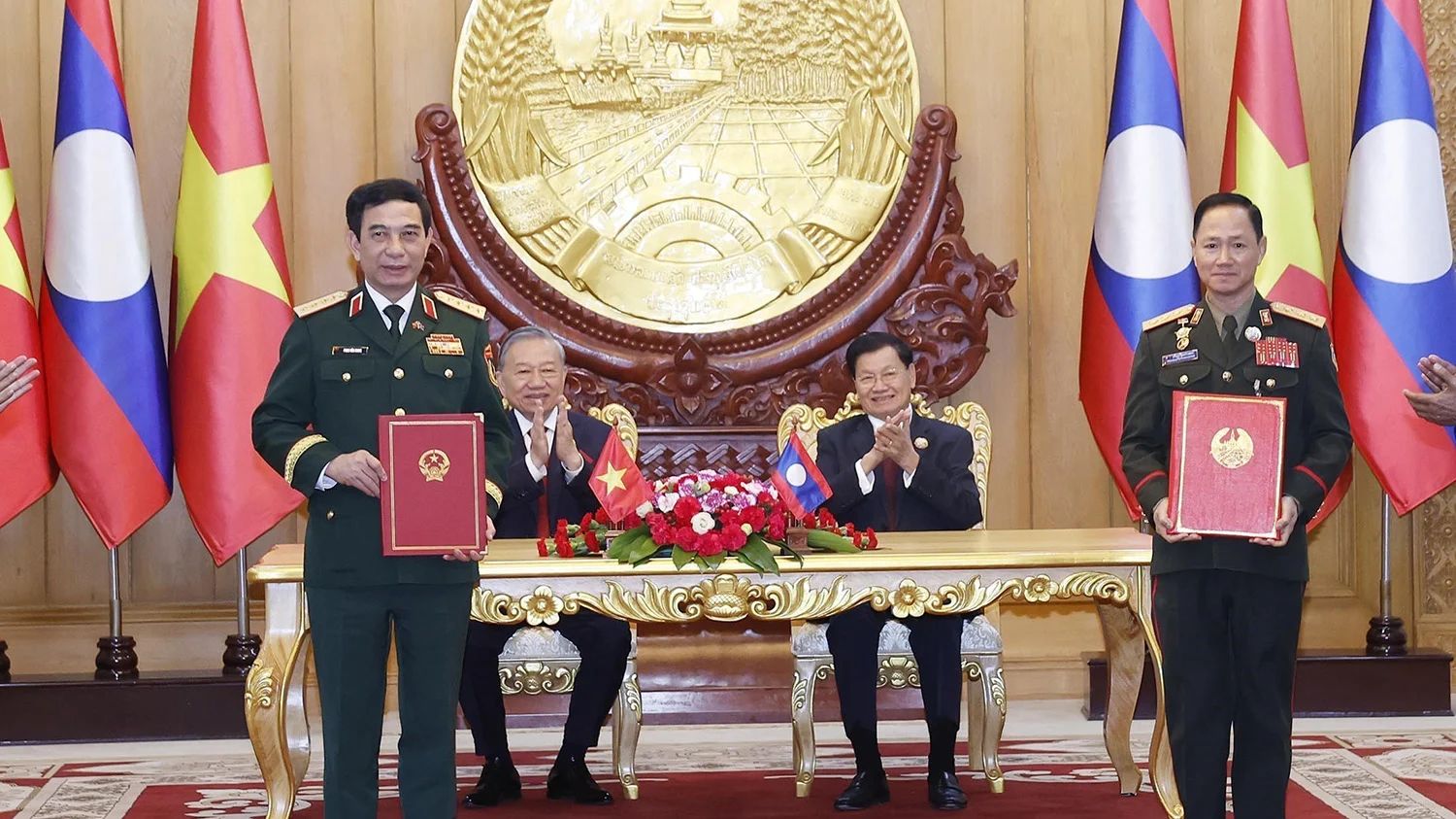 Генеральный секретарь ЦК КПВ То Лам и Генеральный секретарь ЦК НРПЛ, Президент Лаоса Тхонглун Сисулит присутствуют на церемонии вручения Плана сотрудничества на 2026 год между Министерством обороны Вьетнама и Министерством обороны Лаоса. Фото: ВИА