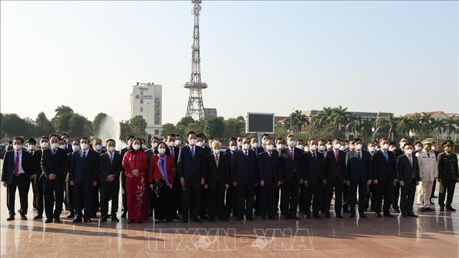 Tổng Bí thư Nguyễn Phú Trọng và các đồng chí lãnh đạo, nguyên lãnh đạo Đảng, Nhà nước tại Tượng đài Tổng Bí thư Nguyễn Văn Linh ở thành phố Hưng Yên, tỉnh Hưng Yên. (Ảnh: Trí Dũng/TTXVN)