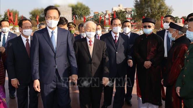 Tổng Bí thư Nguyễn Phú Trọng dâng hoa tại Tượng đài Tổng Bí thư Nguyễn Văn Linh ở thành phố Hưng Yên, tỉnh Hưng Yên. (Ảnh: Trí Dũng/TTXVN)