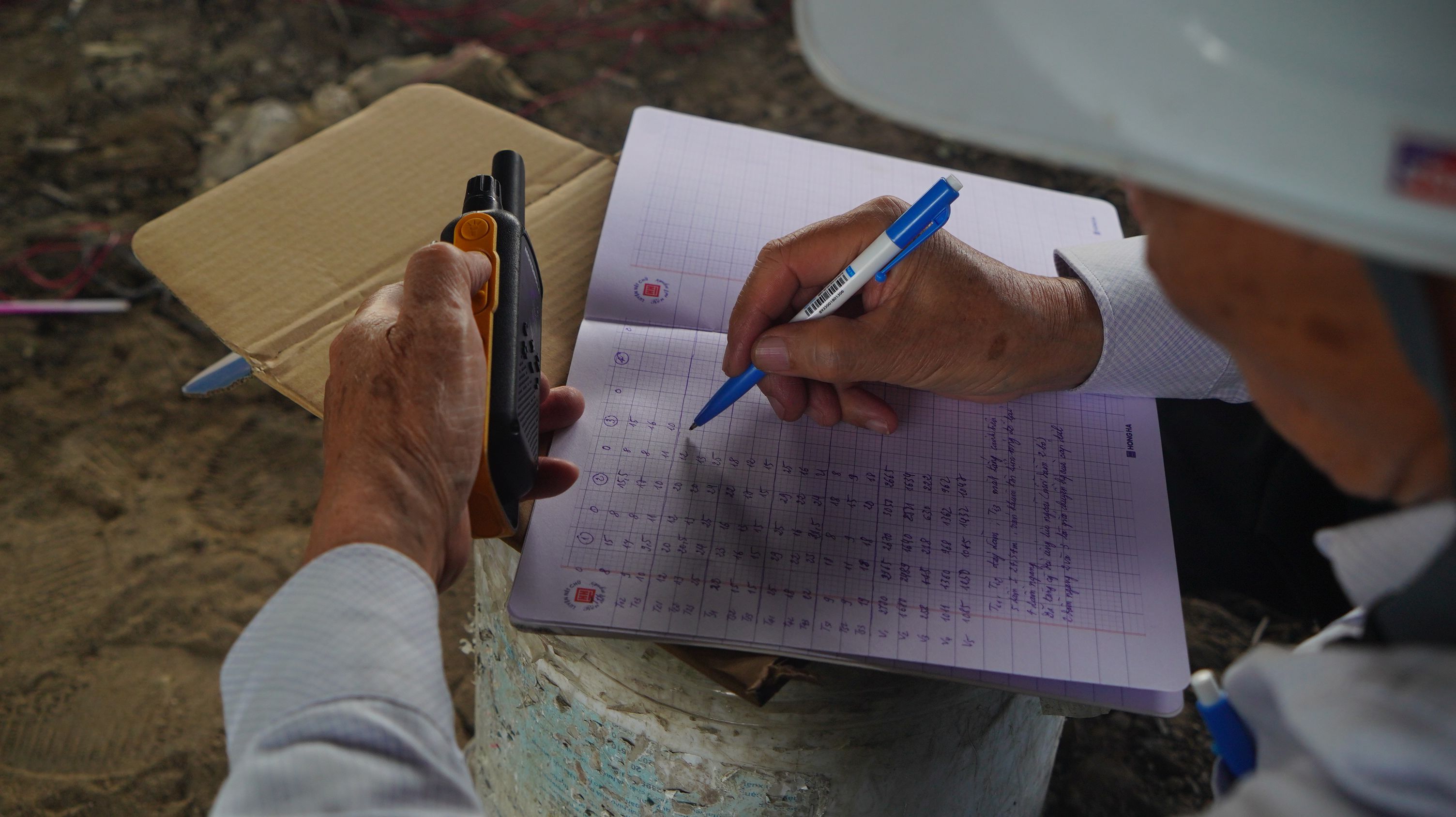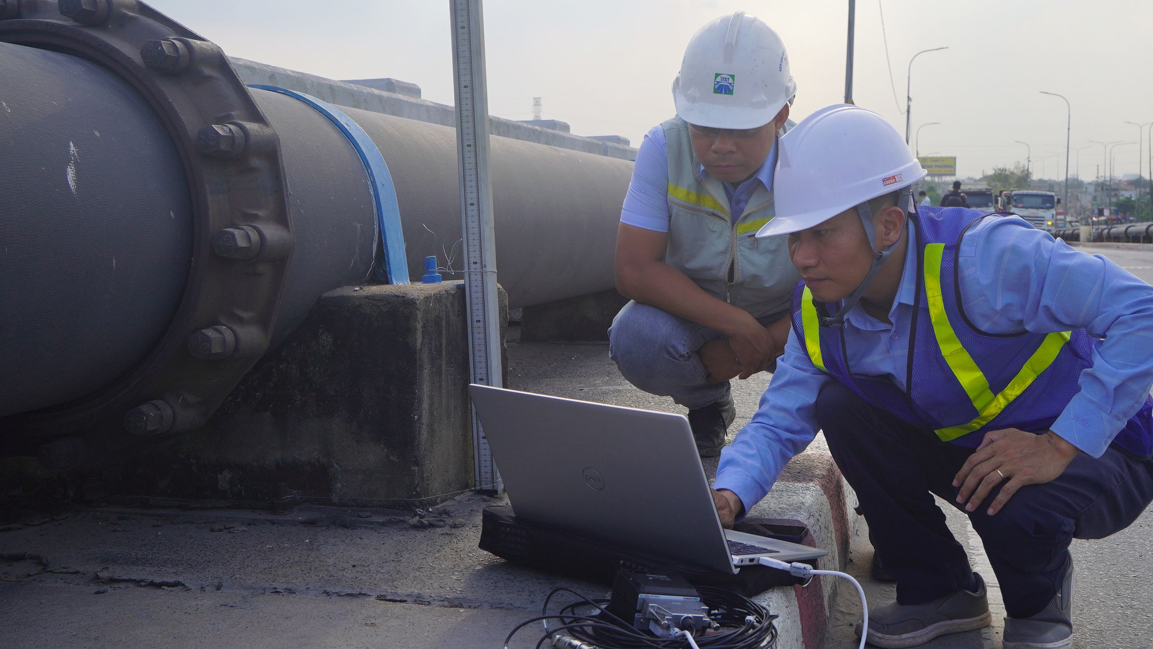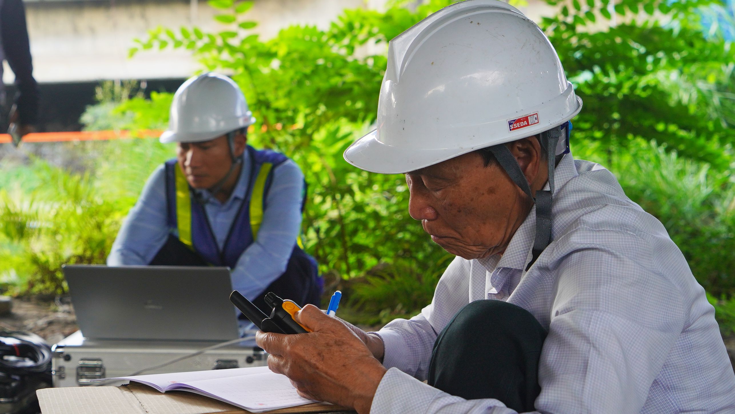 Các kỹ sư tập trung đo đạc và giám sát chặt chẽ các thông số kỹ thuật tại chân cầu Bình Phước 1.