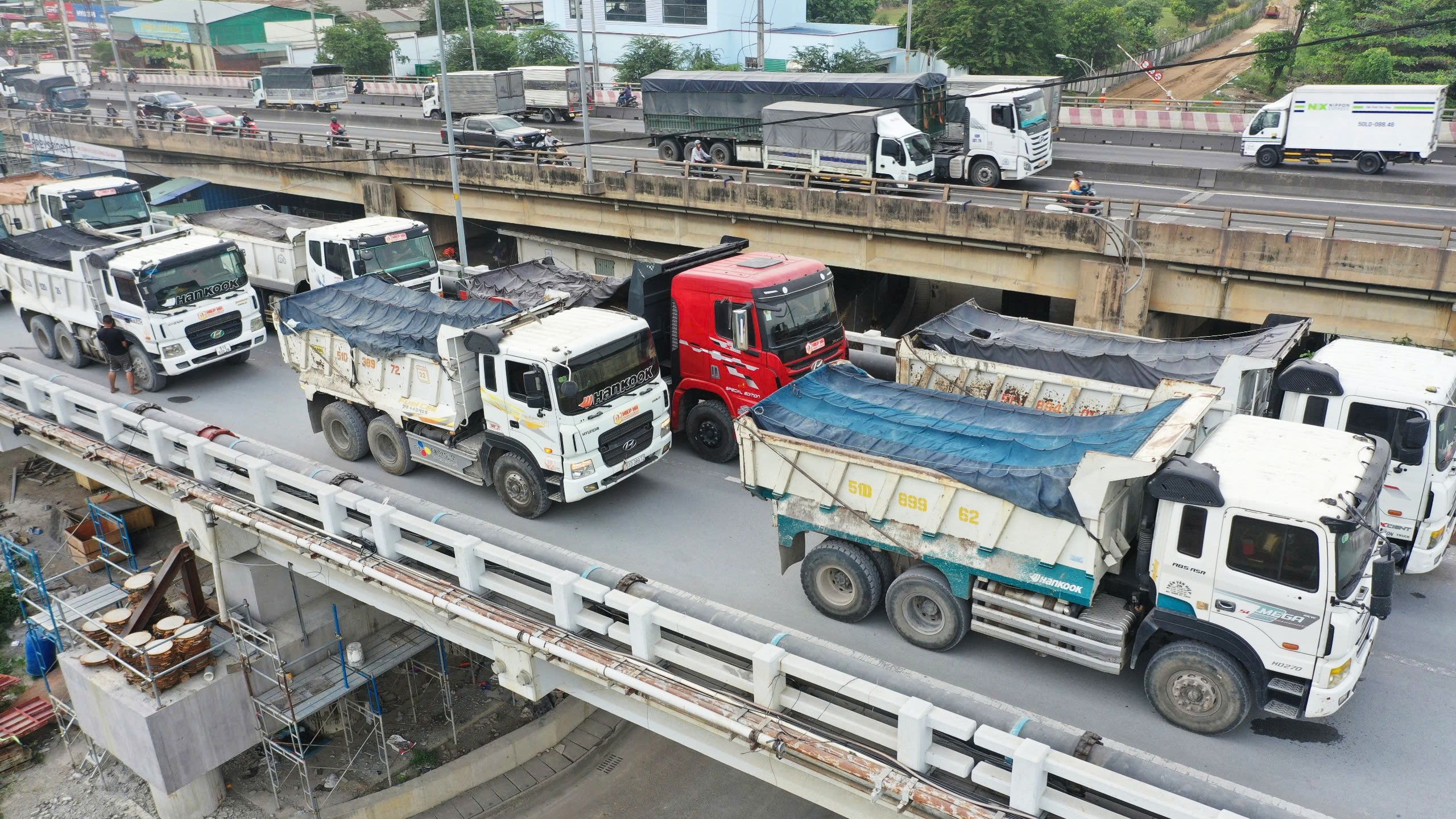 Các xe tải trọng 25–27 tấn được huy động để “thử sức” kết cấu tại khu vực cầu chính.