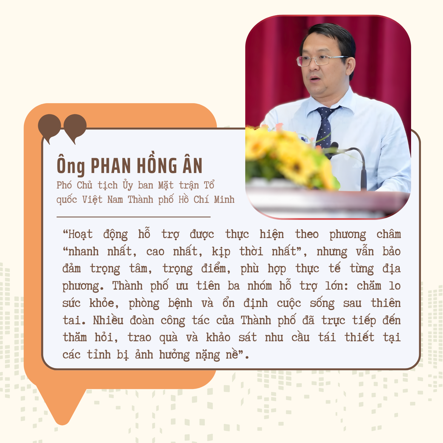 Hiện nay, tình hình mưa lũ vẫn còn diễn biến phức tạp. Nhiều địa phương đang rất cần sự hỗ trợ thêm về lương thực, thuốc men, vật dụng sinh hoạt và các nguồn lực để tái thiết cuộc sống sau bão. Thành phố Hồ Chí Minh tiếp tục kêu gọi cộng đồng doanh nghiệp, tổ chức tôn giáo, kiều bào và các tầng lớp nhân dân đồng hành, chia sẻ với bà con.