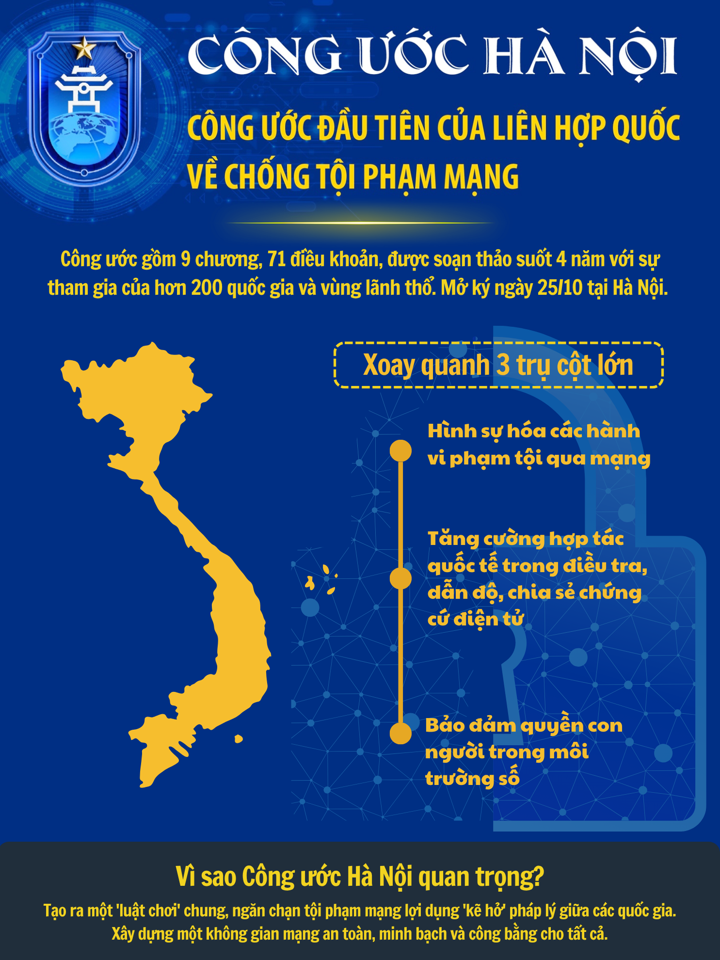 Đặc biệt, theo kế hoạch, thành phố sẽ tập trung tạo lập niềm tin số, xây dựng môi trường mạng trung thực, văn minh, lành mạnh, phòng chống vi phạm pháp luật trên không gian mạng. Mới nhất, ngày 25 / 10 / 2025, Chủ tịch nước Lương Cường, Tổng thư ký Liên hợp quốc và lãnh đạo, đại diện các nước tham dự Lễ mở ký Công ước của Liên hợp quốc về chống tội phạm mạng tại Hà Nội chính là bước ngoặt lớn nhất, đánh dấu sự quyết liệt của Việt Nam trong phòng chống tội phạm an ninh phi truyền thống.