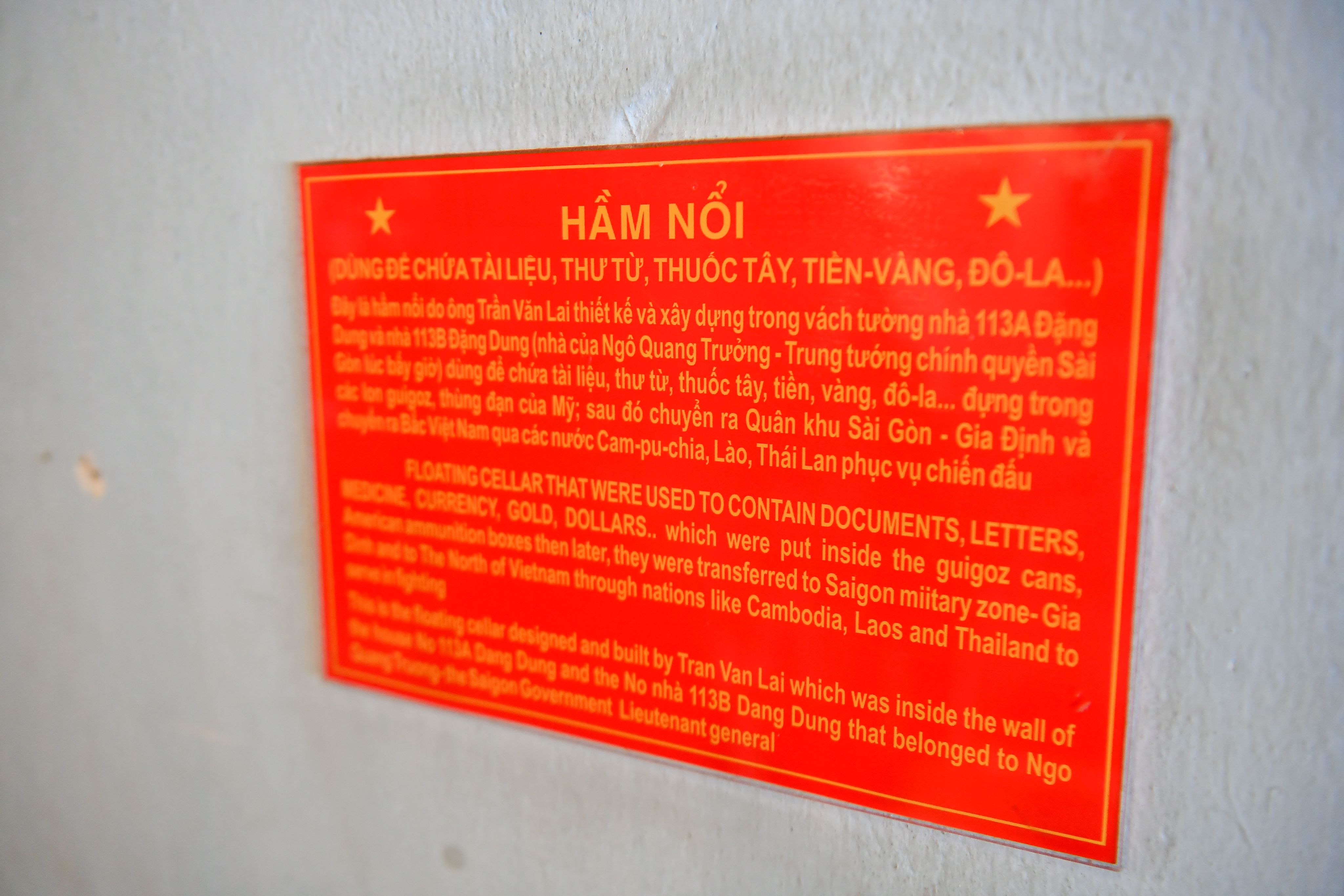 Vách tường giữa nhà 113A Đặng Dung và 113B Đặng Dung chính là một hầm nổi. Nếu đi vào trong quán, hầm nổi nằm trên tầng 2, rộng chưa đầy 20cm. Đây là nơi cất giấu tài liệu, thuốc men, tiền, vàng… đựng trong các lon sắt, thùng đạn Mỹ. Căn hầm được đào bên trong vách tường, ngụy trang dưới lớp sàn gỗ. Những chiếc lon sắt được dùng để cất giấu thư từ, tài liệu mật, thuốc men.