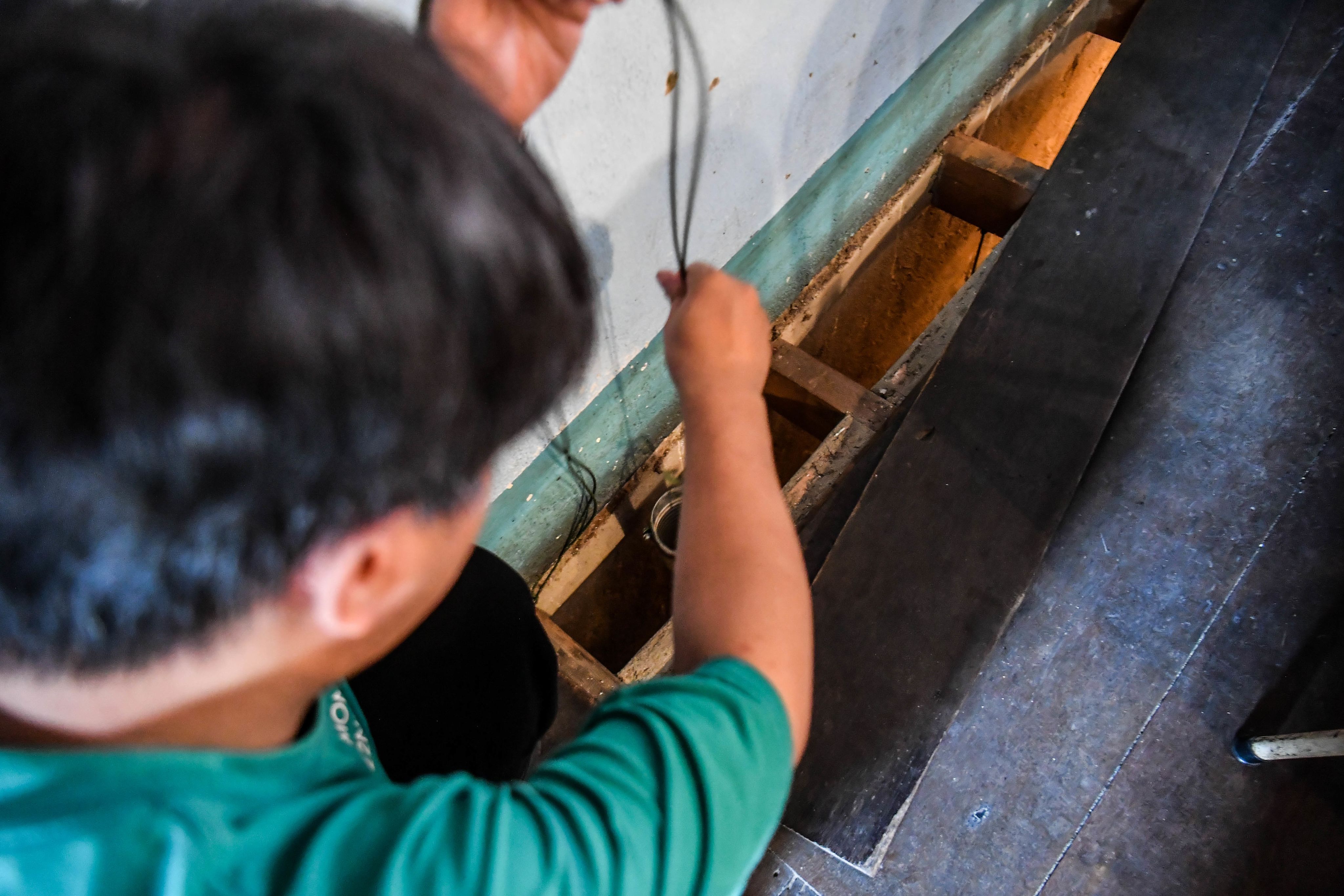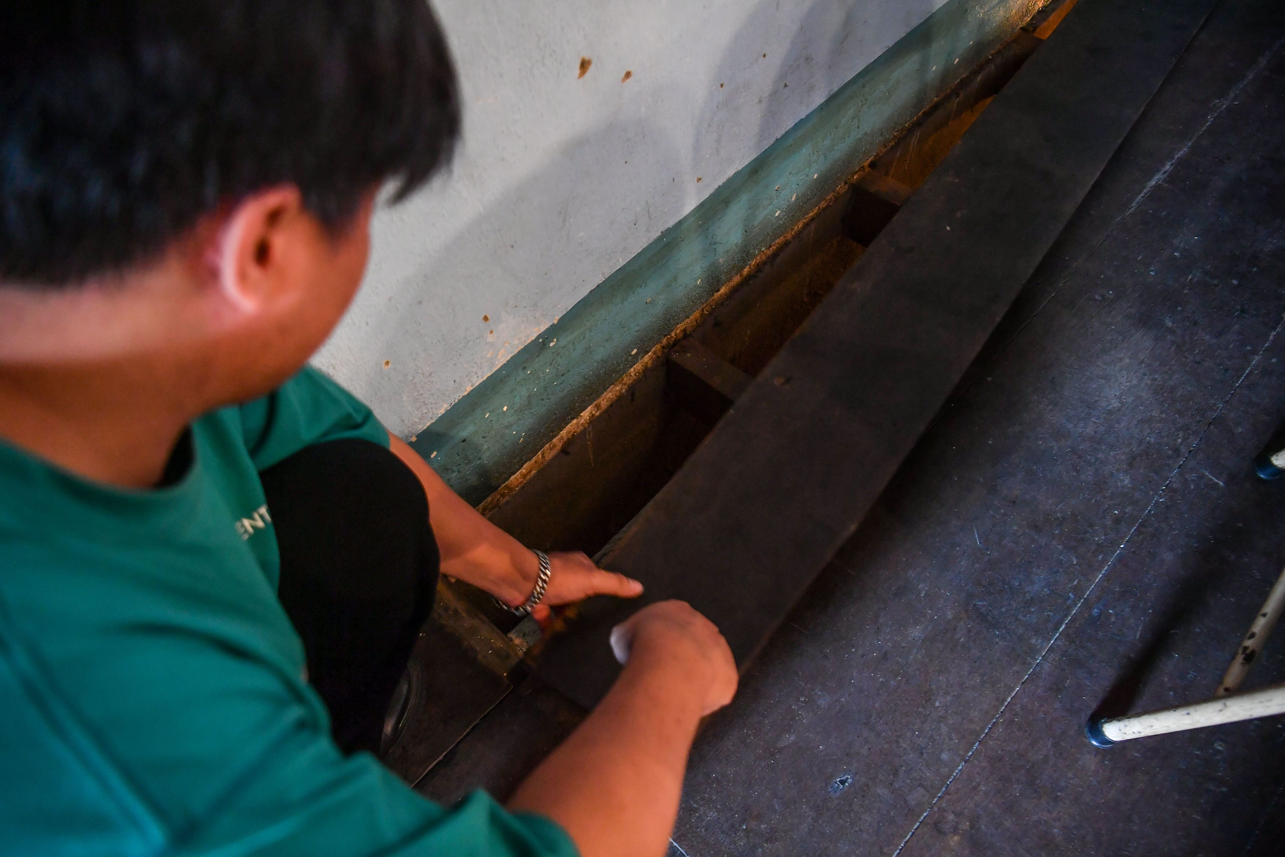 Căn hầm được đào bên trong vách tường, ngụy trang dưới lớp sàn gỗ.