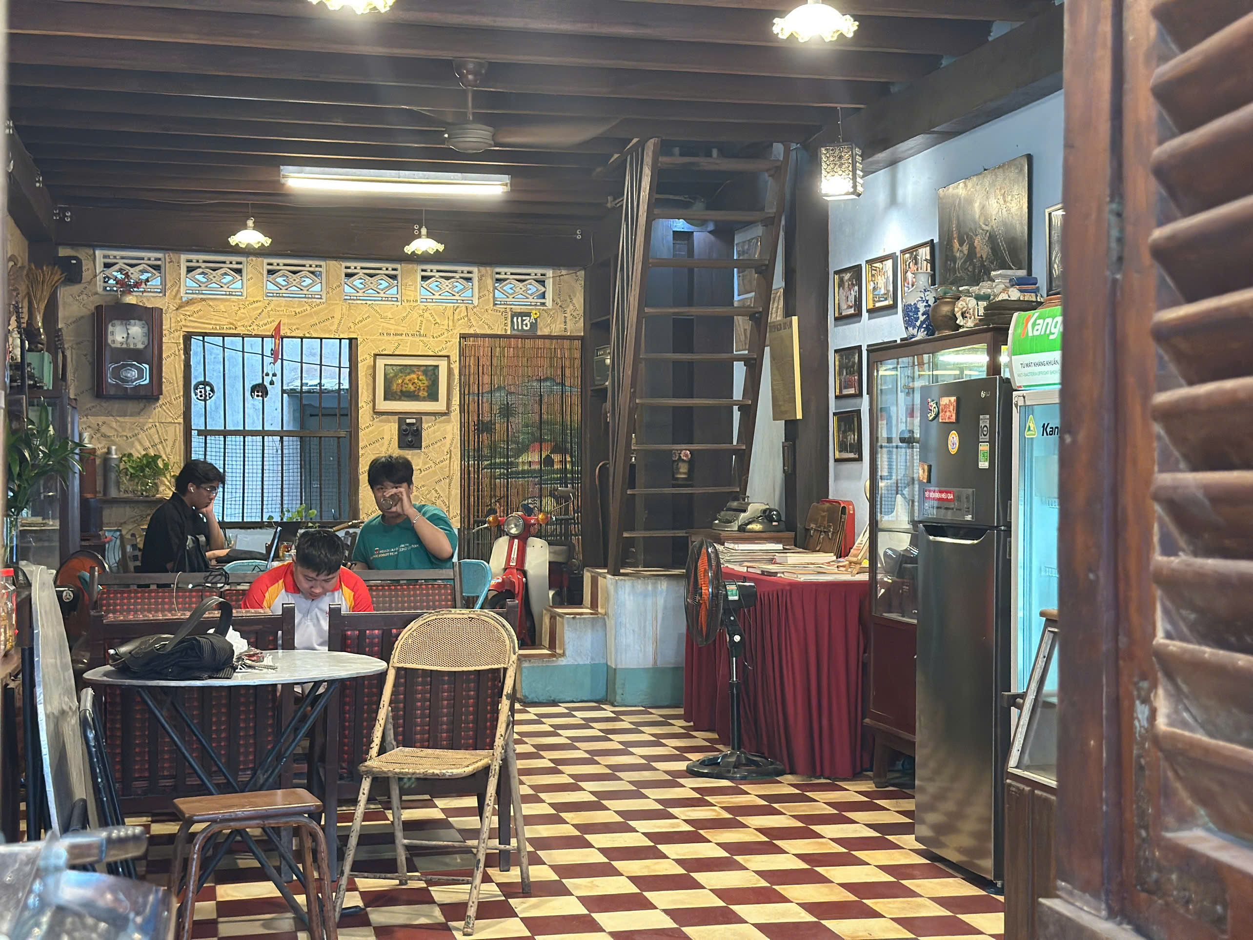 Không gian hoài cổ với cầu thang gỗ, và nền gạch trắng đỏ xen kẽ.