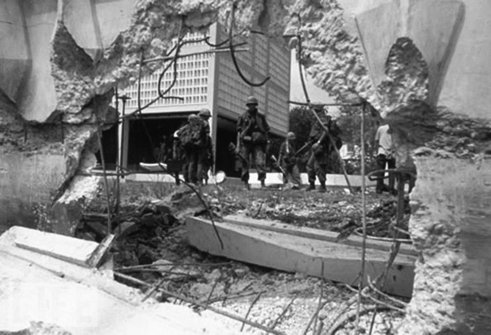 Trận tập kích vào tòa Đại sứ Mỹ ở Sài Gòn đêm 30, rạng ngày 31/1/1968 đã gây chấn động dư luận Mỹ và thế giới. Ngày 1/2/1968, hình ảnh Tòa đại sứ Mỹ bị tấn công được đăng trên trang nhất tờ New York Times đã làm bàng hoàng cả nước Mỹ. Từ sau Chiến tranh Thế giới thứ hai, chưa bao giờ người Mỹ lại được nhìn hình ảnh chiến tranh gần và nóng bỏng đến như vậy. (Ảnh: Tư liệu quốc tế/TTXVN phát)