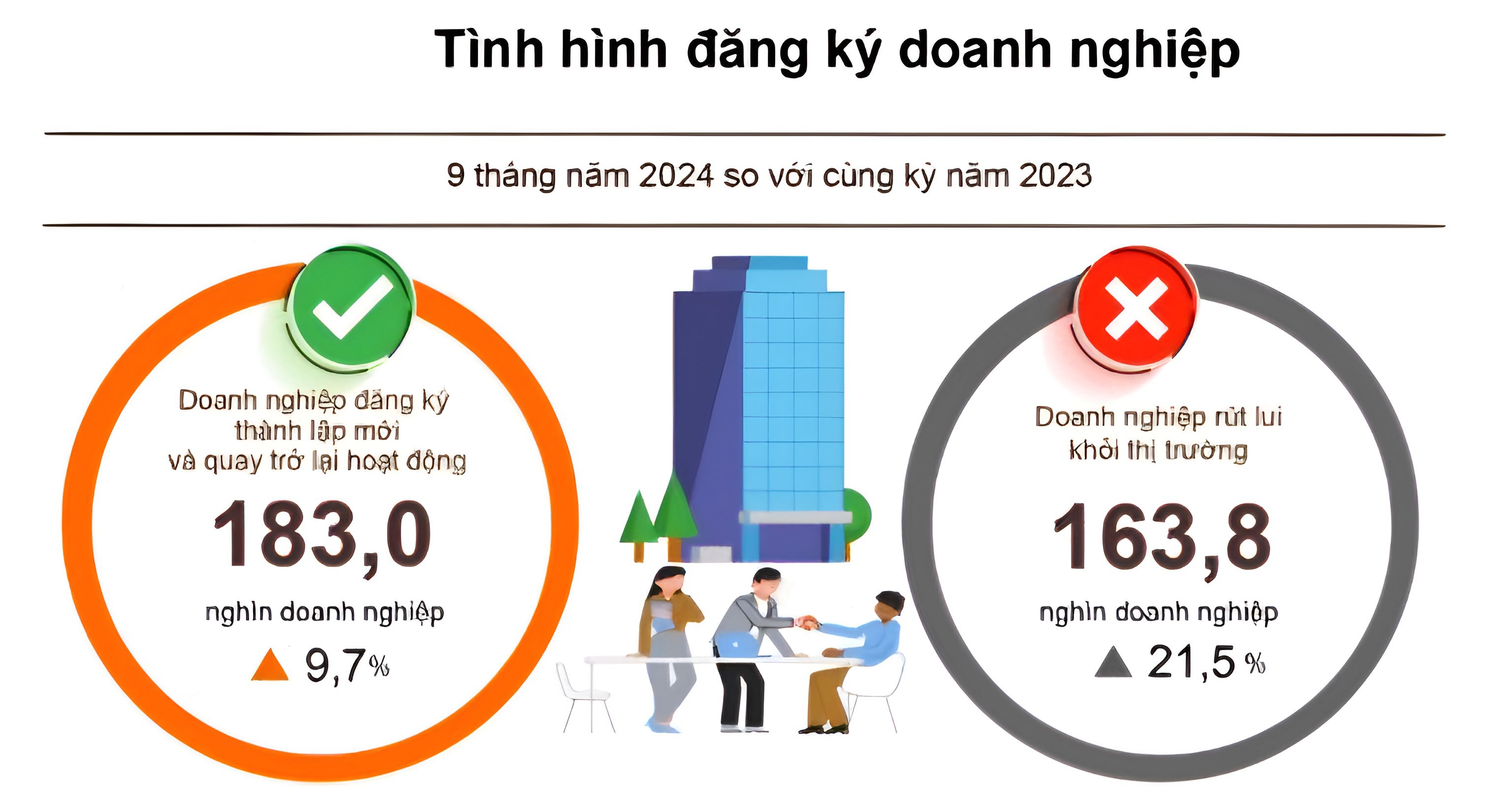 Tính chung 9 tháng năm 2024, cả nước có gần 121,9 nghìn doanh nghiệp đăng ký thành lập mới với tổng số vốn đăng ký là hơn 1.158,5 nghìn tỷ đồng và tổng số lao động đăng ký hơn 735,0 nghìn lao động, tăng 3,4% về số doanh nghiệp, tăng 3,4% về vốn đăng ký và giảm 3,4% về số lao động so với cùng kỳ năm trước.