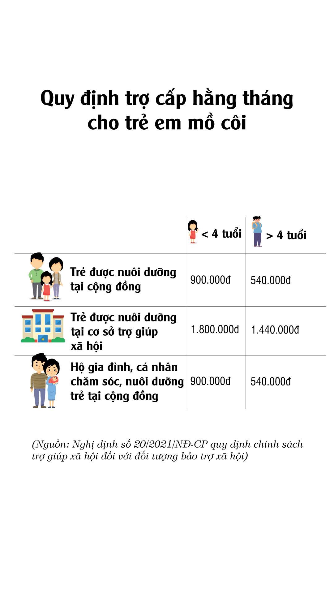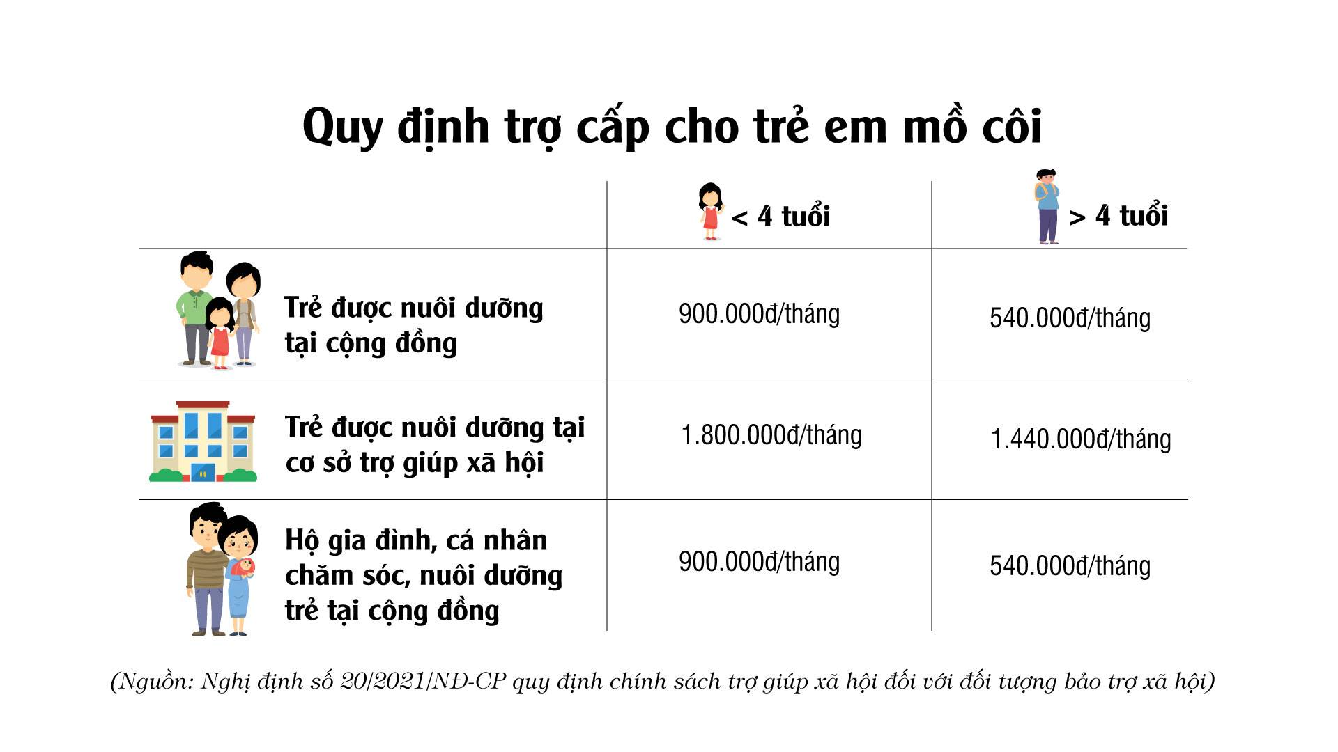 Ngoài ra, trẻ mồ côi cha hoặc mẹ do dịch, người còn lại bị bệnh ung thư, hiểm nghèo được hỗ trợ 650 nghìn đồng/trẻ/tháng. Trẻ mồ côi cha hoặc mẹ do dịch, người còn lại có mức thu nhập bằng hoặc thấp hơn mức hộ cận nghèo thì được hỗ trợ 480 nghìn đồng/trẻ/tháng. Việc hỗ trợ được thực hiện cho đến khi trẻ đủ 18 tuổi.