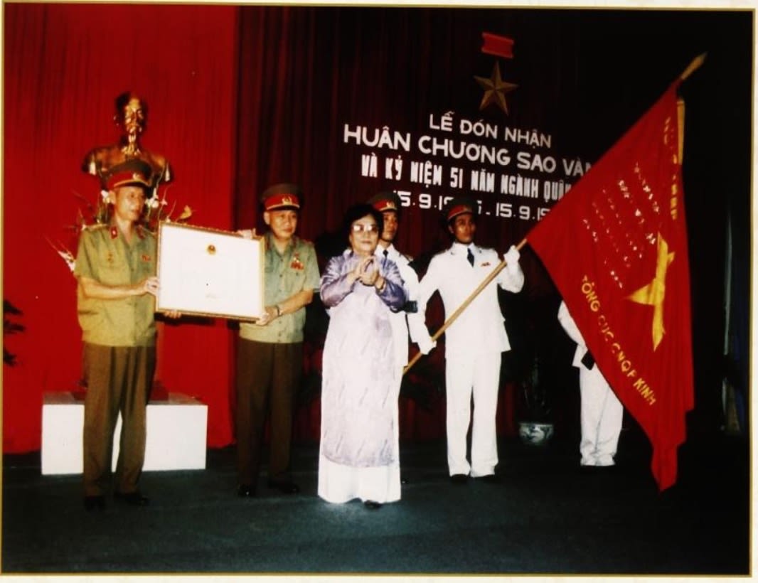 Phó Chủ tịch nước Nguyễn Thị Bình trao Huân chương Sao Vàng cho ngành quân giới năm 1996. (Nguồn: 60 năm Công nghiệp quốc phòng Việt Nam, Nhà xuất bản Quân đội nhân dân)