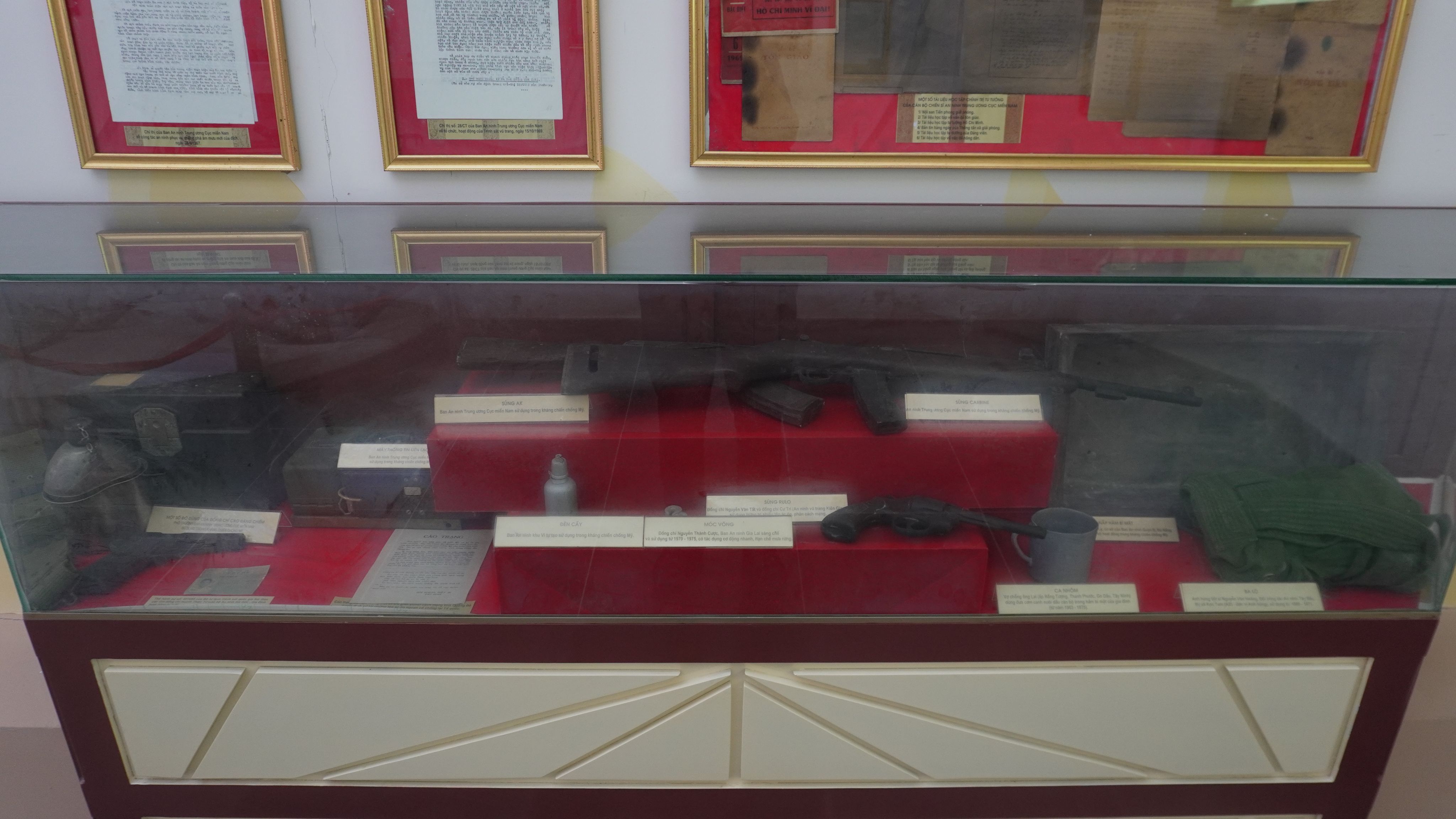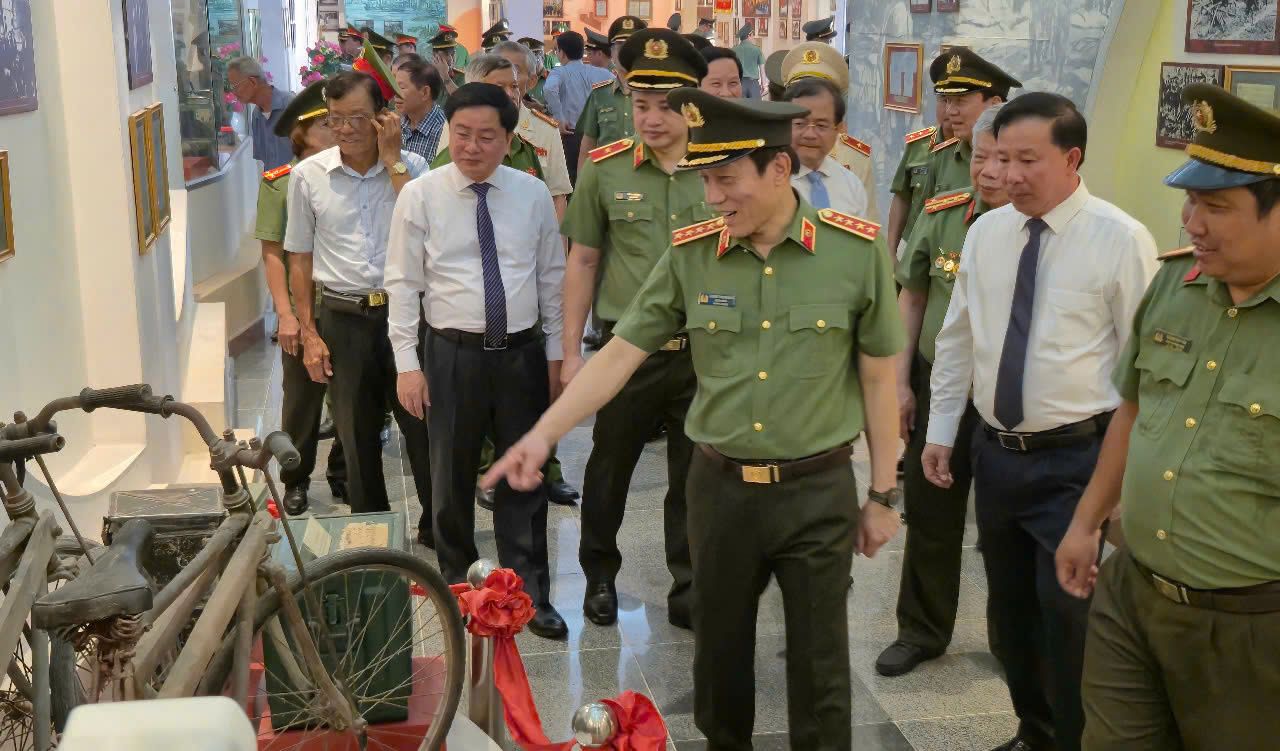 Đại tướng Lương Tam Quang, Ủy viên Bộ Chính trị, Bộ trưởng Công an xem quân dụng trưng bày tại Bảo tàng Ban An ninh Trung ương Cục miền nam.