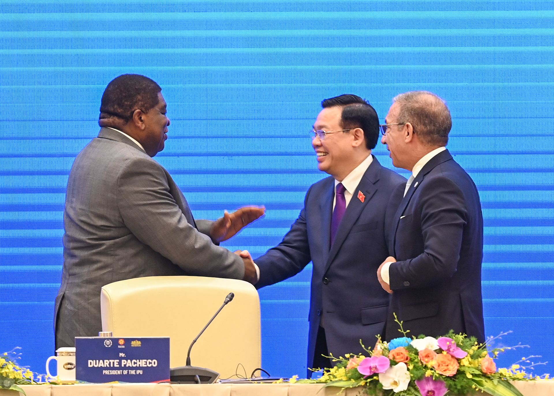 Chủ tịch Quốc hội Vương Đình Huệ, Chủ tịch Liên minh Nghị viện Thế giới Duarte Pacheco và Tổng thư ký Liên minh Nghị viện Thế giới Martin Chungong tại phiên bế mạc Hội nghị Nghị sĩ trẻ toàn cầu lần thứ 9. Ảnh: DUY LINH