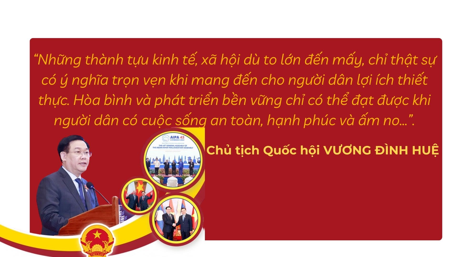 Chủ tịch Quốc hội đã chia sẻ Việt Nam được xem là một câu chuyện điển hình về đoàn kết toàn dân tộc, nỗ lực vươn lên thành công trước “bão dông” từ tác động, thay đổi sâu sắc của thế giới và khu vực. Trong tiến trình đó, Việt Nam xác định, người dân là trung tâm, là chủ thể và động lực chính của công cuộc xây dựng và bảo vệ Tổ quốc.