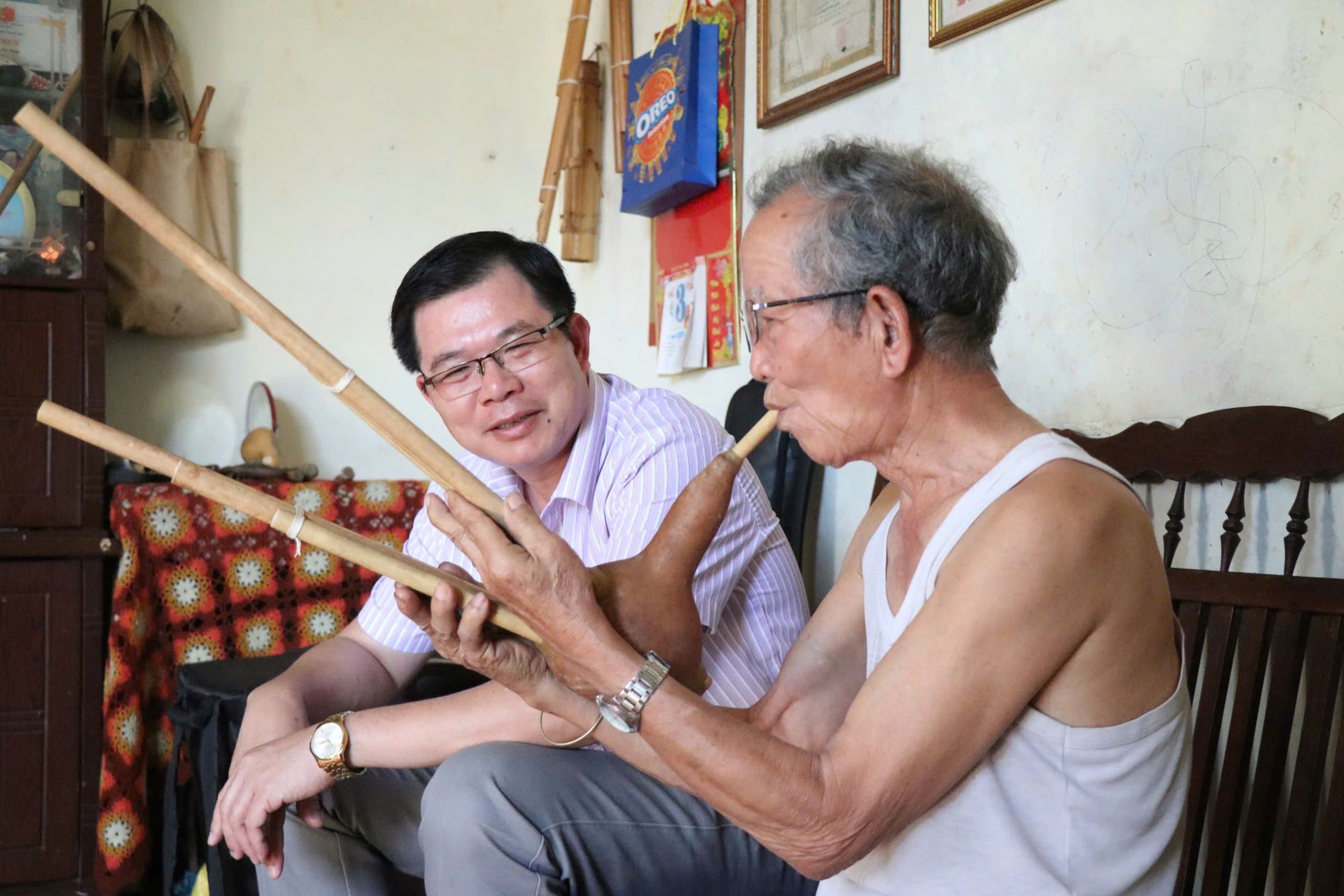 Nghệ nhân Y Bhiông Niê và phóng viên Báo Nhân Dân tại nhà riêng.