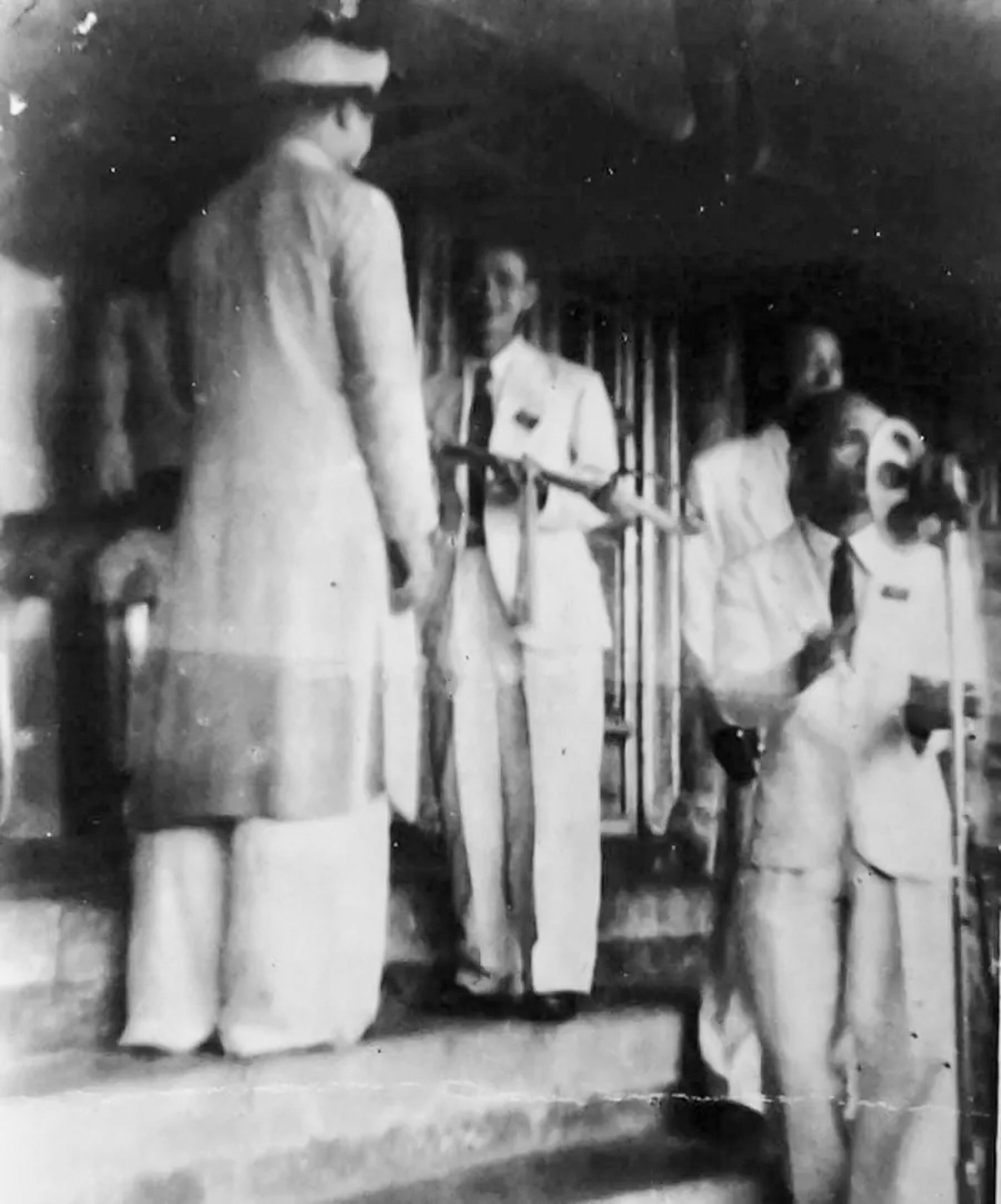 Trưởng đoàn Trần Huy Liệu (phải) nhận thanh kiếm nạm ngọc từ vua Bảo Đại thoái vị, chiều 30/8/1945. (Ảnh: Bảo tàng Lịch sử Thừa Thiên Huế)
