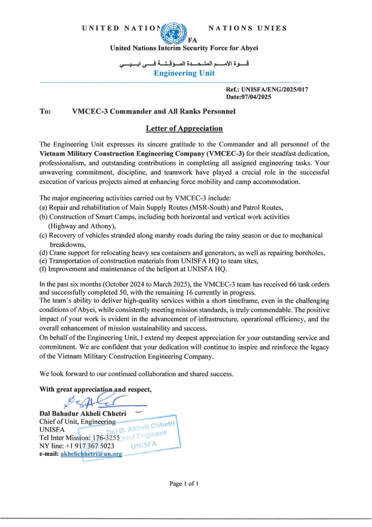 Trong một lá thư khác gửi ngày 7/4/2025, Phòng Công binh, Phái bộ an ninh lâm thời Liên hợp quốc tại Abyei đã gửi lời cảm ơn chân thành đến Chỉ huy trưởng và toàn thể cán bộ, nhân viên của Đội Công binh số 3 Việt Nam vì “đã tận tâm, chuyên nghiệp và có những đóng góp xuất sắc trong việc hoàn thành mọi nhiệm vụ công binh được giao. Sự tận tâm trong công việc, tính kỷ luật và tinh thần đồng đội của đơn vị bạn đã đóng một vai trò quan trọng trong việc thực hiện thành công các nhiệm vụ bảo đảm đường cơ động và nâng cao chất lượng cải thiện cơ sở hạ tầng, doanh trại”.
