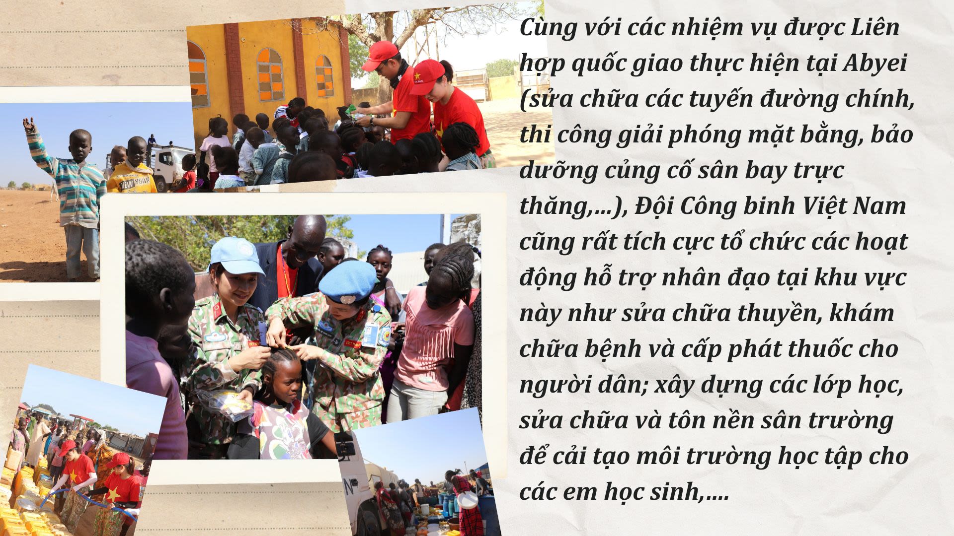 Cùng với các nhiệm vụ được Liên hợp quốc giao thực hiện tại Abyei (sửa chữa các tuyến đường chính, thi công giải phóng mặt bằng, bảo dưỡng củng cố sân bay trực thăng,…), Đội Công binh Việt Nam cũng rất tích cực tổ chức các hoạt động hỗ trợ nhân đạo tại khu vực này như sửa chữa thuyền, khám chữa bệnh và cấp phát thuốc cho người dân; xây dựng các lớp học, sửa chữa và tôn nền sân trường để cải tạo môi trường học tập cho các em học sinh,….