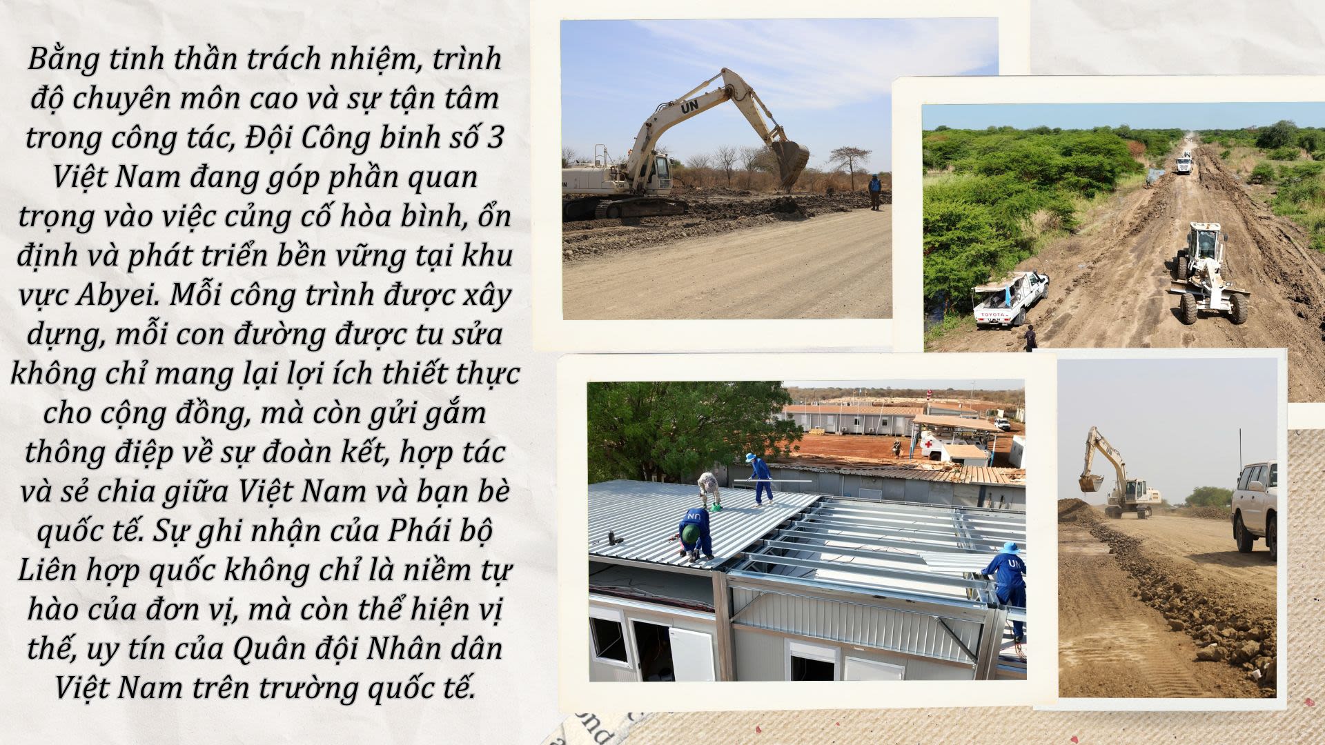 Bằng tinh thần trách nhiệm, trình độ chuyên môn cao và sự tận tâm trong công tác, Đội Công binh số 3 Việt Nam đang góp phần quan trọng vào việc củng cố hòa bình, ổn định và phát triển bền vững tại khu vực Abyei. Mỗi công trình được xây dựng, mỗi con đường được tu sửa không chỉ mang lại lợi ích thiết thực cho cộng đồng, mà còn gửi gắm thông điệp về sự đoàn kết, hợp tác và sẻ chia giữa Việt Nam và bạn bè quốc tế. Sự ghi nhận của Phái bộ Liên hợp quốc không chỉ là niềm tự hào của đơn vị, mà còn thể hiện vị thế, uy tín của Quân đội Nhân dân Việt Nam trên trường quốc tế.