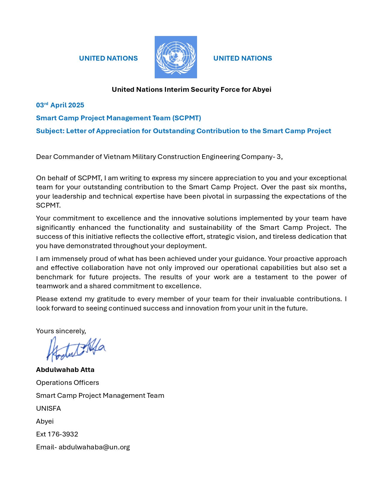 Trong Thư cảm ơn gửi Chỉ huy trưởng Đội Công binh số 3 Việt Nam ngày 3/4/2025, Phòng quản lý Dự án Doanh trại thông minh, Phái bộ An ninh Lâm thời của Liên hợp quốc tại Abyei đã cảm ơn những đóng góp xuất sắc của Đội Công binh số 3 cho dự án Doanh trại thông minh (Smart Camp). Bức thư có đoạn viết: “Trong sáu tháng qua, khả năng lãnh đạo và tính chuyên nghiệp của bạn đã đóng vai trò then chốt trong thực hiện nhiệm vụ, vượt trên kỳ vọng của Phòng quản lý Dự án Doanh trại thông minh. Những nỗ lực của bạn cũng như các quân nhân trong đơn vị, các giải pháp sáng tạo được áp dụng, đã góp phần nâng cao chất lượng vận hành, tính bền bỉ của các công trình thuộc Dự án Doanh Trại thông minh. Điều này phản ánh nỗ lực tập thể, tầm nhìn chiến lược và sự cống hiến không mệt mỏi mà các bạn đã thể hiện trong suốt quá trình triển khai thực hiện nhiệm vụ của mình”.