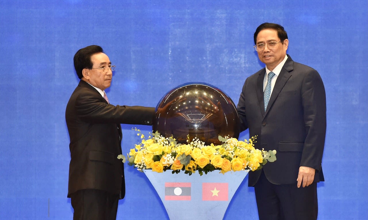 Thủ tướng hai nước thực hiện nghi lễ phát động Năm Đoàn kết Hữu nghị Việt Nam-Lào, Lào-Việt Nam 2022.