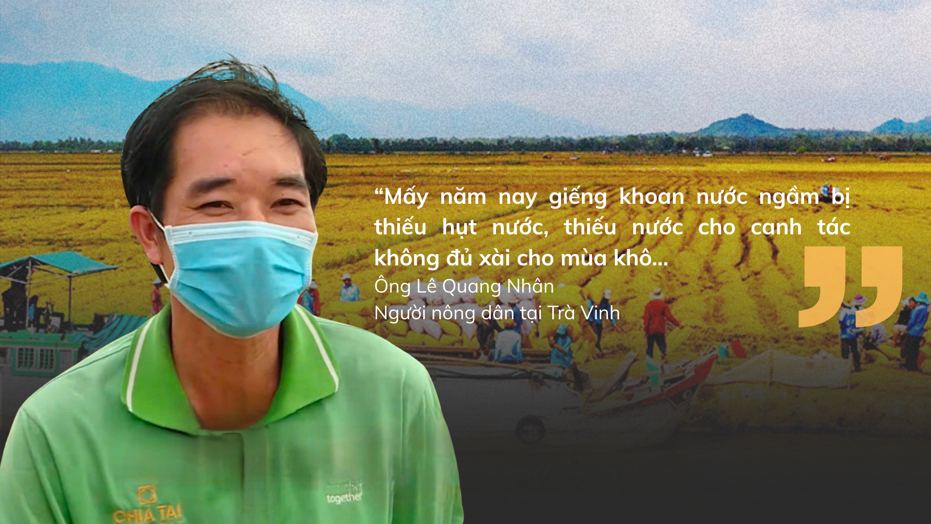 Cách đó nửa vòng Trái Đất, ông Nhân, người nông dân ở Trà Vinh, Việt Nam đã rất lo lắng. Nước với ông vừa mang lại nguồn sống, nhưng cũng có thể là nguồn cơn cướp đi tất cả.