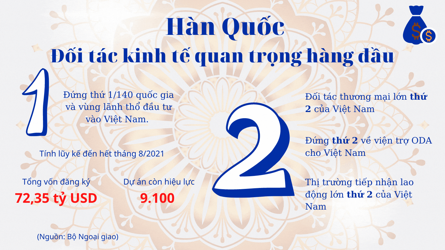 Về hợp tác kinh tế, Hàn Quốc là một trong những đối tác quan trọng hàng đầu của Việt Nam. Tính lũy kế đến hết tháng 8/2021, Hàn Quốc đứng thứ nhất trong tổng số 140 quốc gia và vùng lãnh thổ có dự án đầu tư còn hiệu lực tại Việt Nam, với tổng vốn đăng ký 72,35 tỷ USD, với hơn 9.100 dự án còn hiệu lực. Trong 8 tháng đầu năm 2021, đầu tư của Hàn Quốc vào Việt Nam đạt 2,44 tỷ USD, với 251 dự án mới.