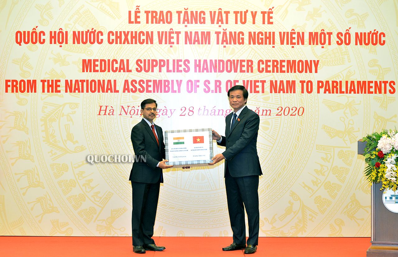 Ngày 29/5/2020, Tổng Thư ký Quốc hội - Chủ nhiệm Văn phòng Quốc hội Nguyễn Hạnh Phúc trao tặng vật tư y tế cho Đại sứ Ấn Độ tại Việt Nam. (Ảnh: quochoi.vn)