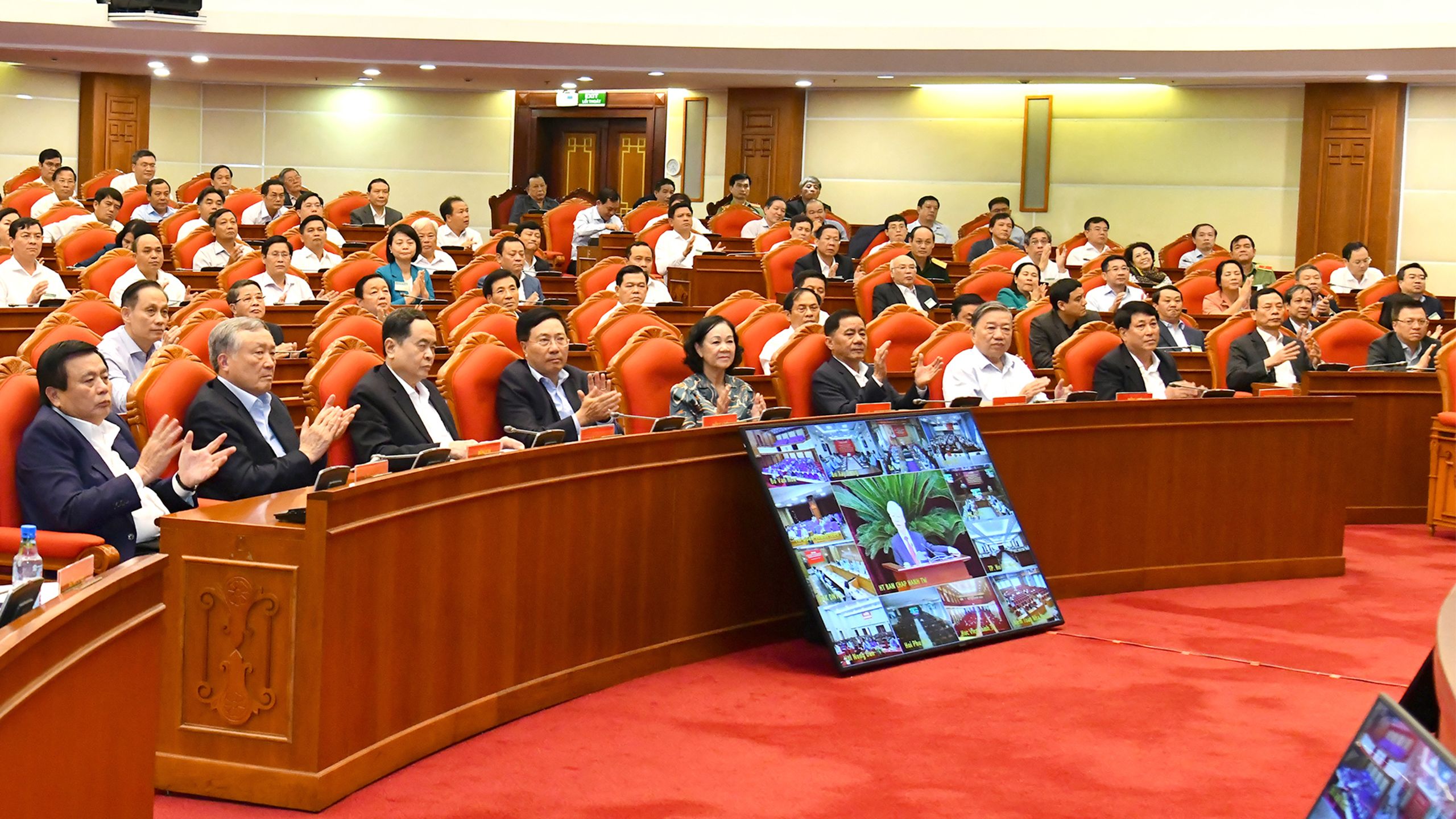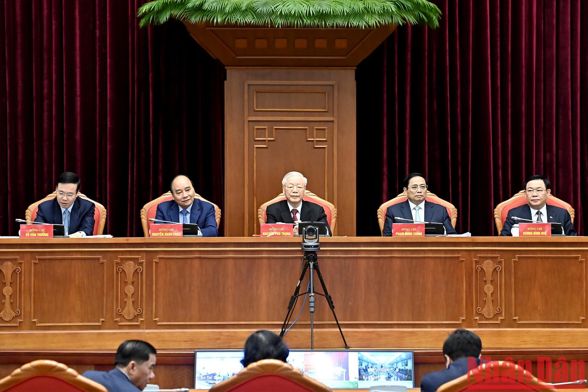 Tổng Bí thư Nguyễn Phú Trọng, Chủ tịch nước Nguyễn Xuân Phúc, Thủ tướng Chính phủ Phạm Minh Chính, Chủ tịch Quốc hội Vương Đình Huệ, Thường trực Ban Bí thư Võ Văn Thưởng đồng chủ trì Hội nghị.