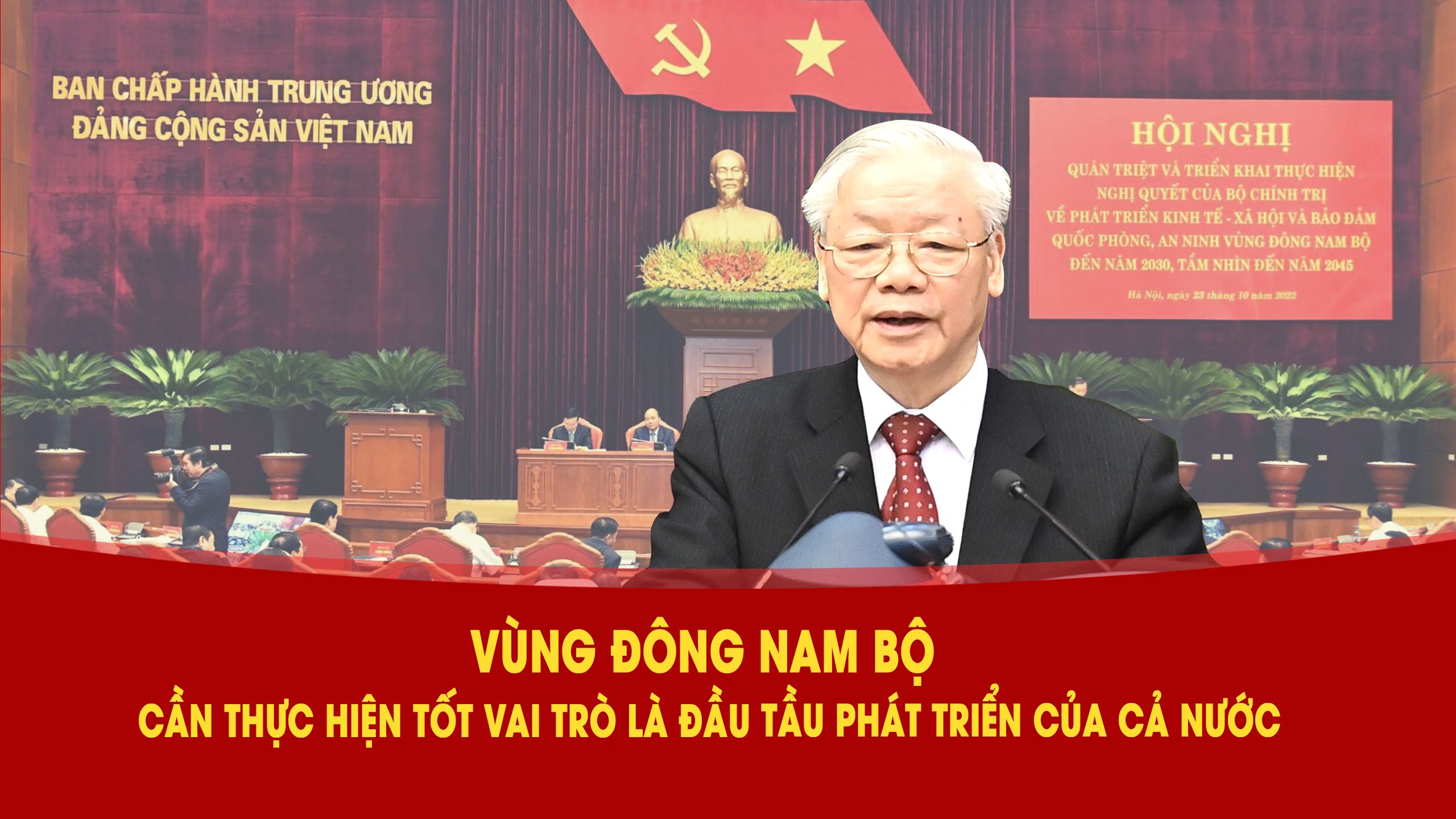Tiếp theo 3 Hội nghị toàn quốc quán triệt, triển khai thực hiện các Nghị quyết mới của Bộ Chính trị khóa XIII này về phát triển kinh tế-xã hội, bảo đảm quốc phòng, an ninh ở các Vùng đồng bằng sông Cửu Long, Vùng Trung du và miền núi Bắc Bộ, và mới đây là Vùng Tây Nguyên vừa được tổ chức rất thành công vào tuần trước, hôm nay Bộ Chính trị tổ chức Hội nghị cán bộ toàn quốc (trực tiếp kết hợp với trực tuyến) để phổ biến, quán triệt những nội dung cơ bản của Nghị quyết số 24-NQ/TW về phương hướng phát triển kinh tế-xã hội và bảo đảm quốc phòng, an ninh vùng Đông Nam Bộ đến năm 2030, tầm nhìn đến năm 2045 (vừa được Bộ Chính trị ban hành ngày 7/10/2022), nhằm quán triệt sâu rộng trong toàn hệ thống chính trị và cả nước, đặc biệt là vùng Đông Nam Bộ, tạo sự thống nhất cao về nhận thức và hành động trong toàn Đảng, toàn dân, toàn quân ta để triển khai thực hiện thật tốt Nghị quyết quan trọng này. (Sắp tới chúng ta cũng sẽ còn tổ chức 2 Hội nghị toàn quốc nữa để tiếp tục triển khai thực hiện Nghị quyết của Bộ Chính trị về phát triển kinh tế-xã hội, bảo đảm quốc phòng, an ninh ở 2 vùng quan trọng nữa là Vùng đồng bằng Sông Hồng và Vùng Bắc Trung Bộ và Duyên hải miền trung).