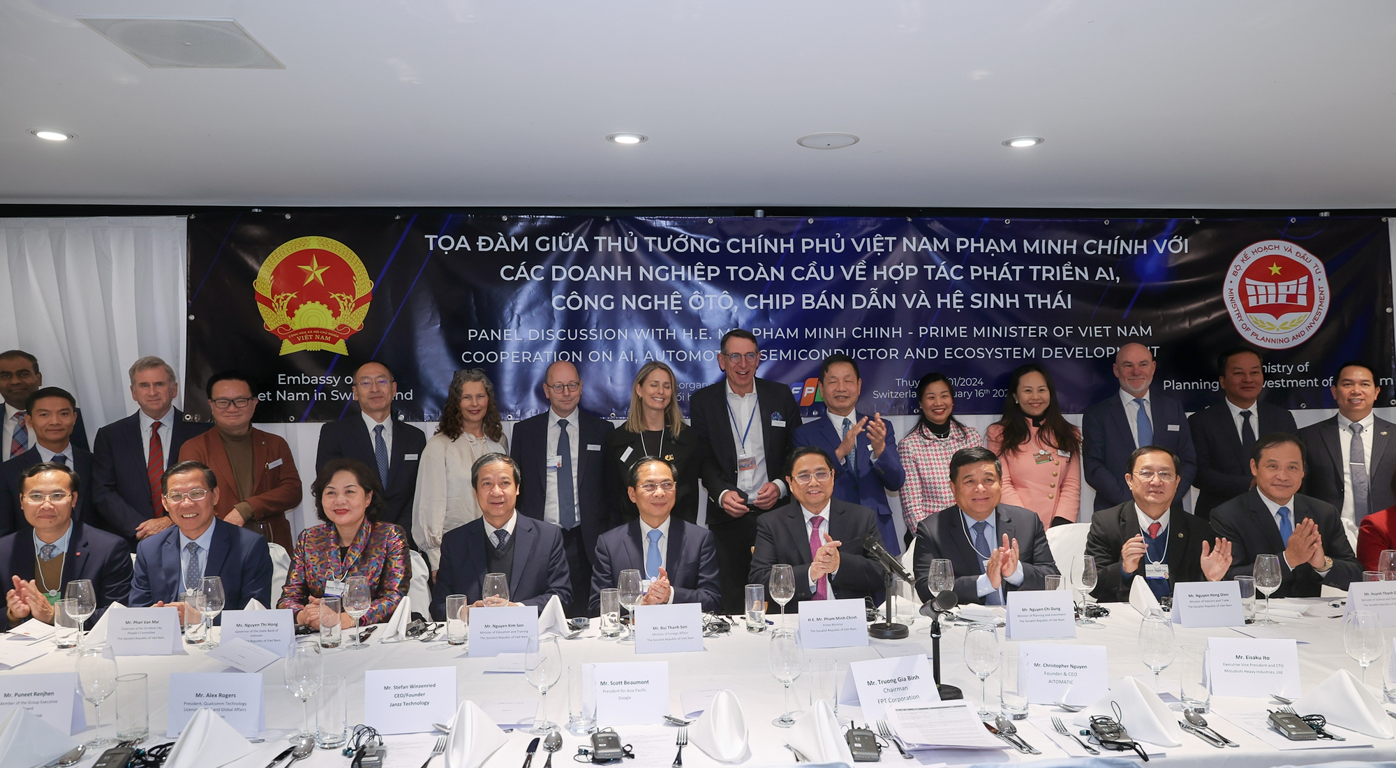 Dans le cadre d'un déplacement pour assister au Forum économique mondial (WEF), le Premier ministre Pham Minh Chinh préside un dialogue avec des entreprises sur la coopération dans les domaines de l'intelligence artificielle (IA), de l'industrie automobile, du développement des puces semi-conductrices et des écosystèmes. Photo : VGP.