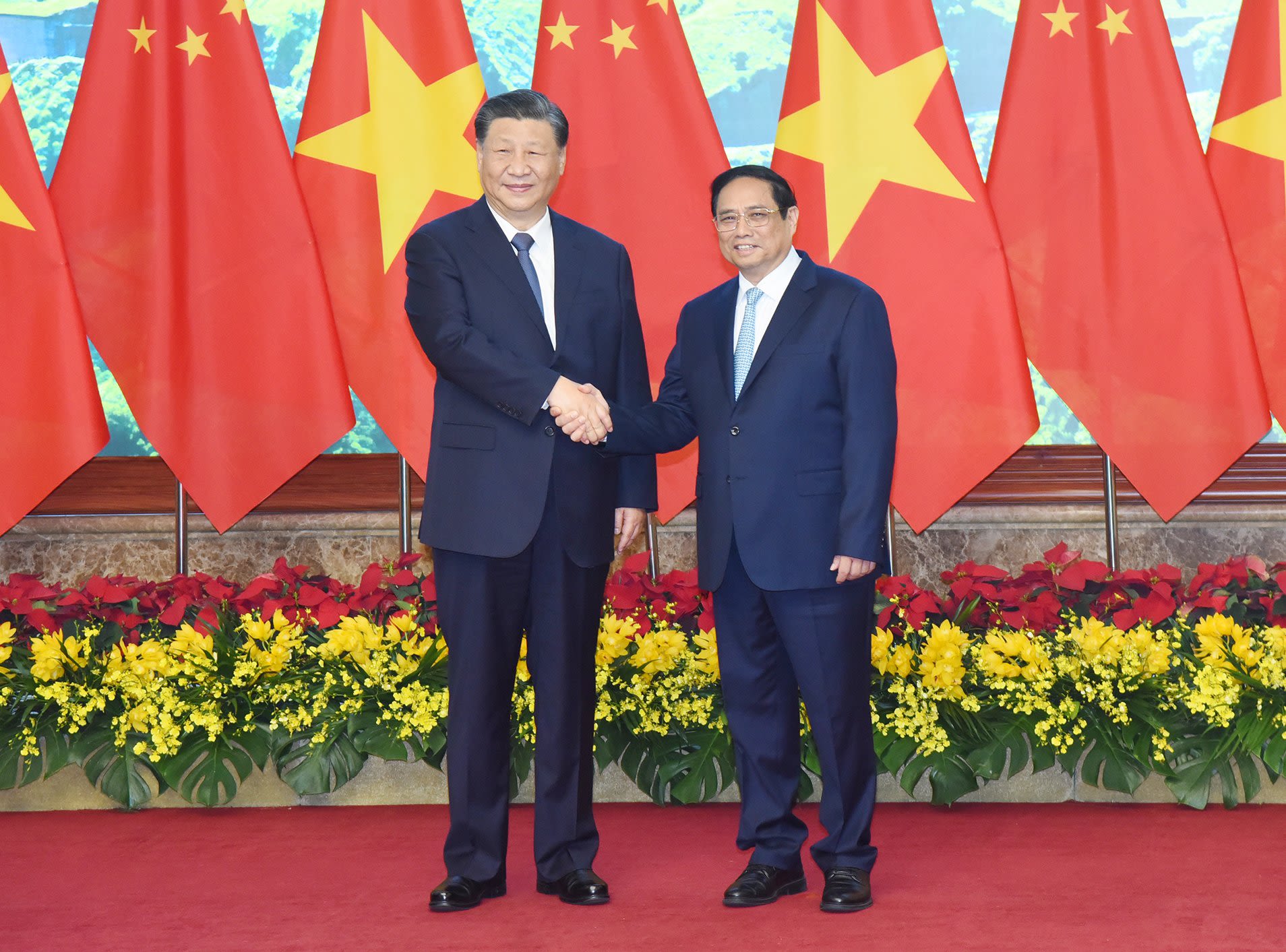 Le Premier ministre Pham Minh Chinh tient une entrevue avec le Secrétaire général du Comité central du Parti communiste chinois (PCC) et Président de la République populaire de Chine, Xi Jinping, dans le cadre de sa visite d'État au Vietnam, le 13 décembre. Photo : VNA.