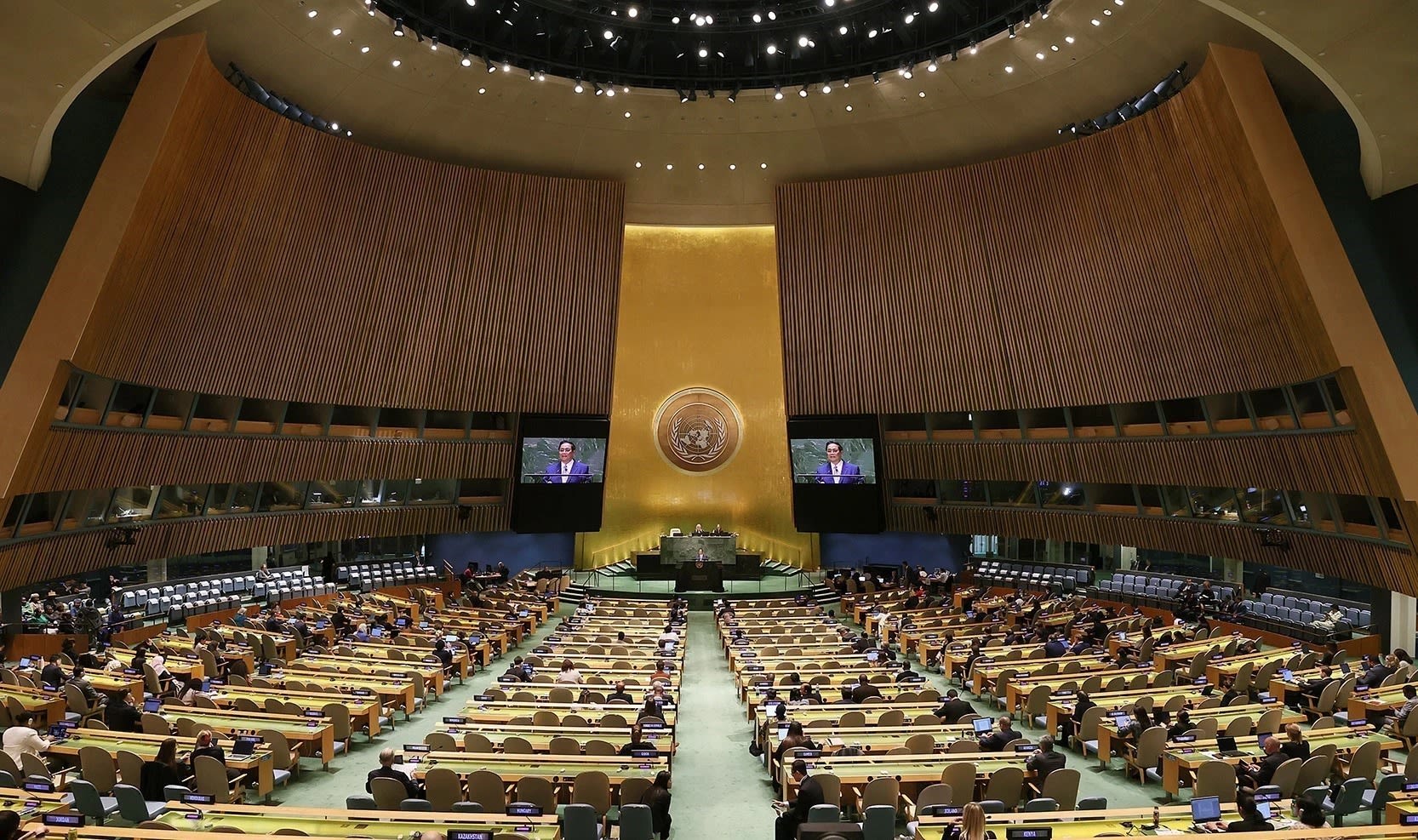 Le Premier ministre Pham Minh Chinh prononce un discours lors du débat général de la 78e session de l'Assemblée générale des Nations Unies, le 22 septembre 2023. Photo : VNA.