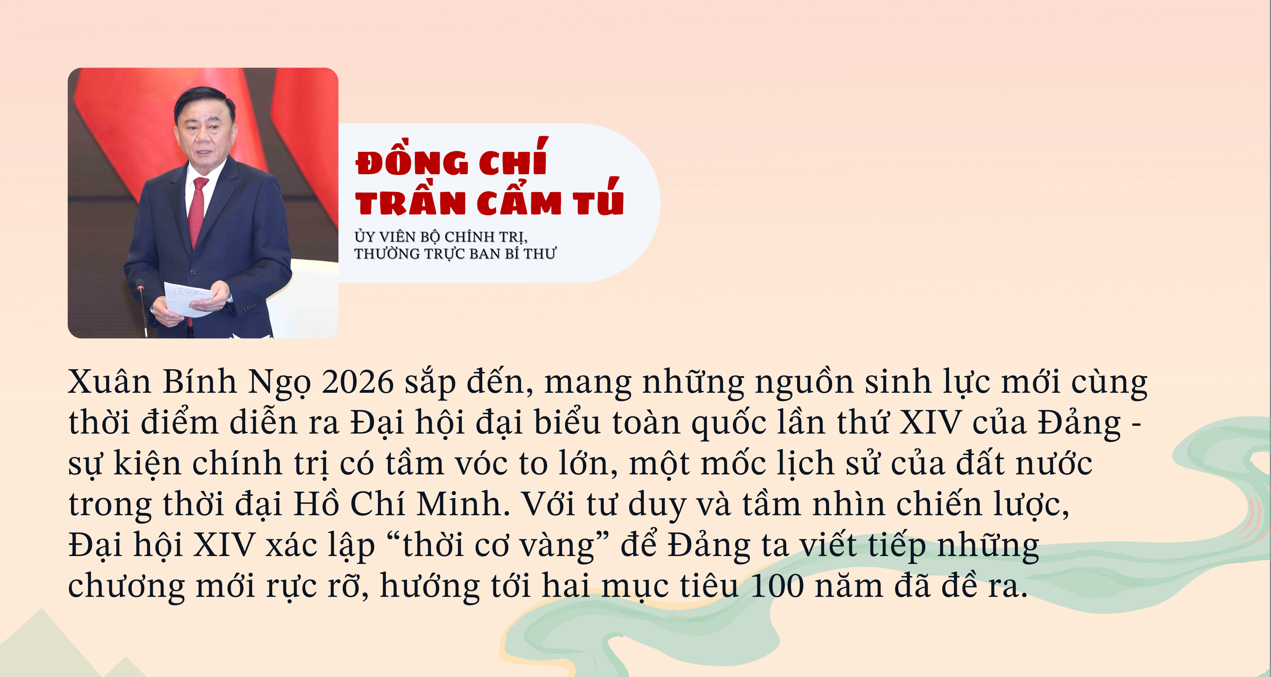 Xuân Bính Ngọ 2026 sắp đến mang những nguồn sinh lực mới cùng thời điểm diễn ra Đại hội đại biểu toàn quốc lần thứ XIV của Đảng - sự kiện chính trị có tầm vóc to lớn, một mốc lịch sử của đất nước trong thời đại Hồ Chí Minh. Với tư duy và tầm nhìn chiến lược, Đại hội XIV xác lập “thời cơ vàng” để Đảng ta viết tiếp những chương mới rực rỡ, hướng tới hai mục tiêu 100 năm đã đề ra.