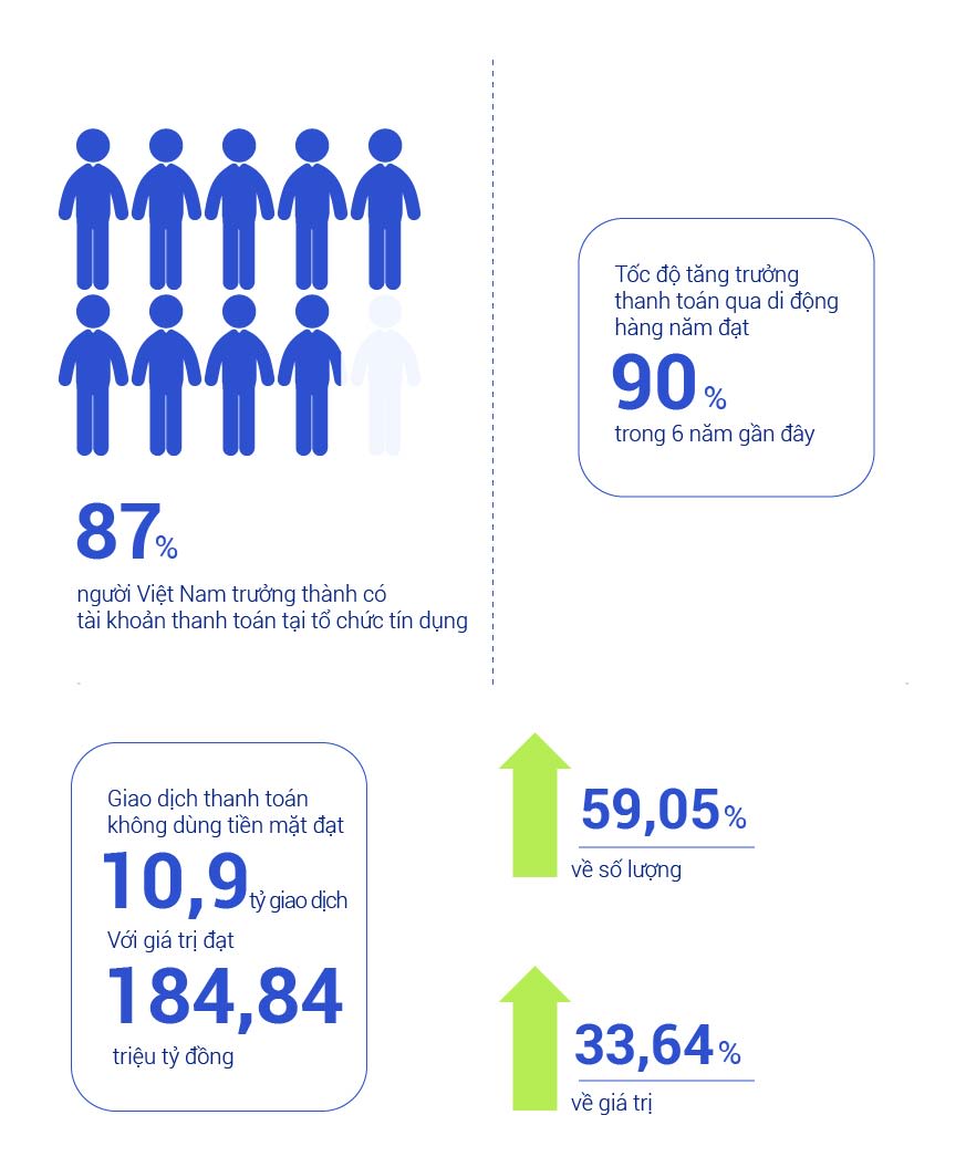 Nhiều tổ chức tín dụng tại Việt Nam có tỷ lệ trên 90% giao dịch thực hiện trên kênh số. Đến hết năm 2023, hơn 87% người Việt Nam trưởng thành có tài khoản thanh toán tại tổ chức tín dụng, tốc độ tăng trưởng thanh toán qua di động hàng năm đạt trên 90% trong 6 năm gần đây; trong 8 tháng đầu năm 2024 so với cùng kỳ năm 2023, giao dịch thanh toán không dùng tiền mặt đạt 10,9 tỷ giao dịch với giá trị đạt 184,84 triệu tỷ đồng (tăng 59,05% về số lượng và 33,64% về giá trị).