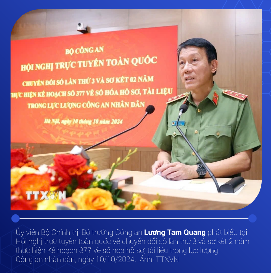 Phát biểu tại Hội nghị trực tuyến toàn quốc về Chuyển đổi số lần thứ 3 và sơ kết 2 năm thực hiện Kế hoạch 377 về số hóa hồ sơ, tài liệu trong lực lượng Công an nhân dân hồi đầu tháng 10/2024, Thứ trưởng Công an Nguyễn Văn Long, Phó Trưởng Ban Thường trực Ban chỉ đạo Chuyển đổi số Bộ Công an cho biết, năm 2024, Bộ Công an xác định là năm chuyển đổi từ trạng thái làm việc truyền thống sang môi trường điện tử và thực hiện chuyển đổi số trên các mặt công tác.