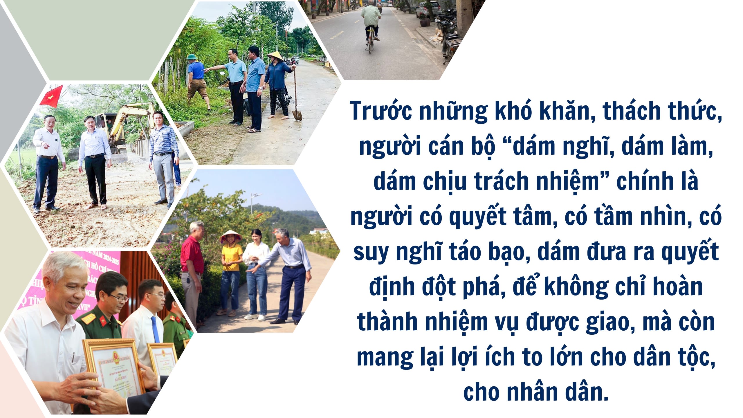 Thực tiễn đã chỉ rõ, trước những khó khăn, thách thức, người cán bộ “dám nghĩ, dám làm, dám chịu trách nhiệm” chính là người có quyết tâm, có tầm nhìn, có suy nghĩ táo bạo, dám đưa ra quyết định đột phá, để không chỉ hoàn thành nhiệm vụ được giao, mà còn mang lại lợi ích to lớn cho dân tộc, cho nhân dân.