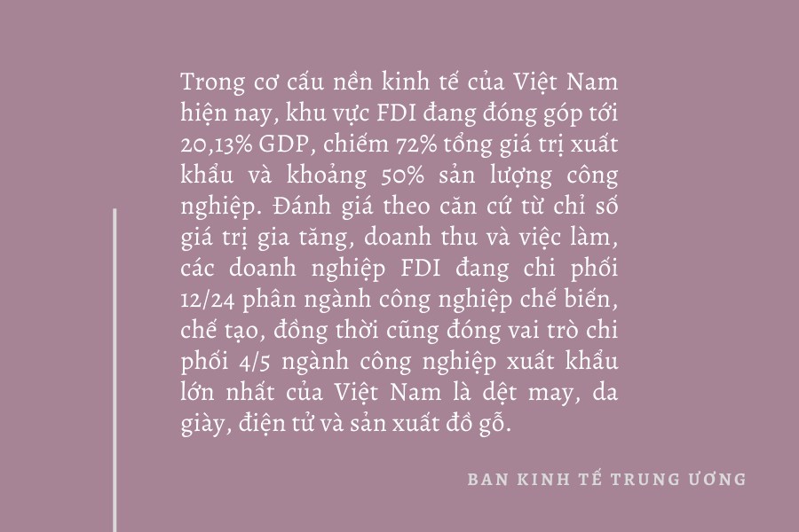 Nhưng đồng tiền có hai mặt. Sự phát triển không đồng tốc giữa FDI và khu vực trong nước dẫn đến rủi ro nền kinh tế phụ thuộc quá lớn vào vốn ngoại, trở thành vấn đề cần giải quyết cấp bách để tăng tính tự chủ của nền kinh tế. Quý I/2017, sự cố lỗi pin của sản phẩm điện thoại Samsung Galaxy Note 7 đã khiến kim ngạch xuất khẩu điện thoại và linh kiện của cả nước lần đầu tiên tăng trưởng âm hơn 10%, kéo giảm mức tăng trưởng của toàn ngành công nghiệp chế biến, chế tạo, tăng trưởng GDP chỉ đạt 5,1%. Quý III/2017, Samsung Việt Nam đưa sản phẩm Samsung Galaxy Note 8 bán ra thị trường và nhà máy thép Formosa khắc phục xong sự cố môi trường, đi vào hoạt động, ngành công nghiệp chế biến, chế tạo lần đầu tiên tăng trưởng 12,77%, có tác dụng làm GDP tăng trưởng đột phá 7,46% và 7,65% trong hai quý còn lại. GDP tăng trưởng trồi sụt theo hoạt động sản xuất của doanh nghiệp FDI lớn và những người làm công tác thông kê cũng thừa nhận, chưa bao giờ dữ liệu kinh tế lại ghi nhận sự biến động bất thường như năm 2017. Tỷ lệ đóng góp của Samsung và Formosa vào mức tăng chung của giá trị sản xuất công nghiệp Việt Nam trong 6 tháng đầu năm 2017 là 46%, đến cùng kỳ năm 2018 chỉ còn 28%.