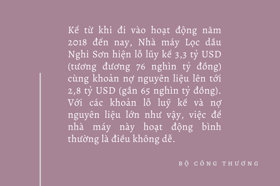 Với tổng vốn đầu tư hơn 9 tỷ USD, công suất đạt 8,4 triệu tấn dầu thô trong giai đoạn đầu và có thể dần nâng lên 10 triệu tấn dầu thô/năm, Nhà máy Lọc dầu Nghi Sơn từng được kỳ vọng sẽ giúp Việt Nam tự chủ nguồn cung xăng dầu. Trong năm 2021, nhà máy này đã sản xuất được 6,7 triệu tấn xăng dầu các loại, giúp giải quyết một phần nhu cầu nội địa (khoảng 34%).