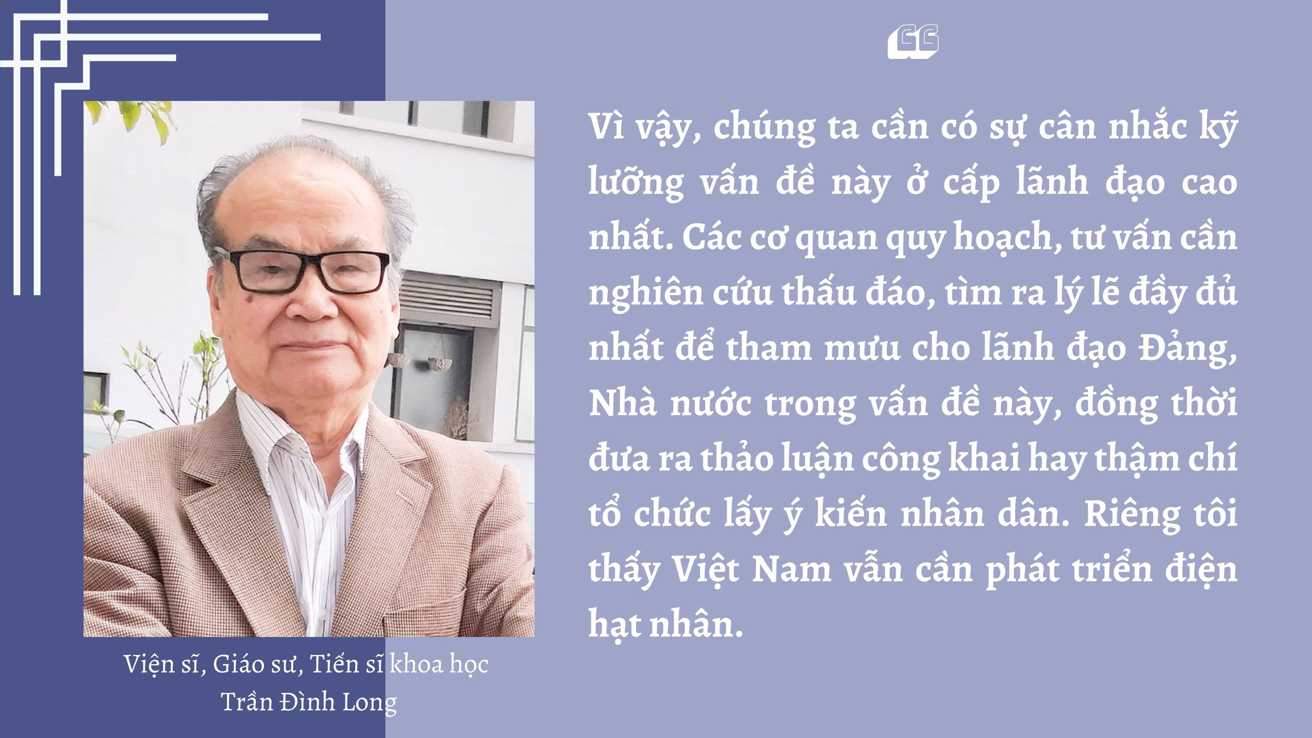Đồng tình việc khuyến khích điện năng lượng tái tạo là hướng đi đúng để phát triển kinh tế xanh, tuy nhiên Viện sĩ, Giáo sư, Tiến sĩ khoa học Trần Đình Long cũng nhấn mạnh tính thiếu ổn định của các nguồn phát cùng yêu cầu bắt buộc phải có các nguồn điện nền khác đi kèm. Trong Quy hoạch điện VIII đã tính đến việc cân đối thêm các nguồn phát nền cũng như tìm ra tỷ lệ phù hợp hơn cho năng lượng tái tạo để vừa đạt mục tiêu giảm phát thải carbon, vừa bảo đảm cân bằng cung cầu và an toàn vận hành hệ thống.