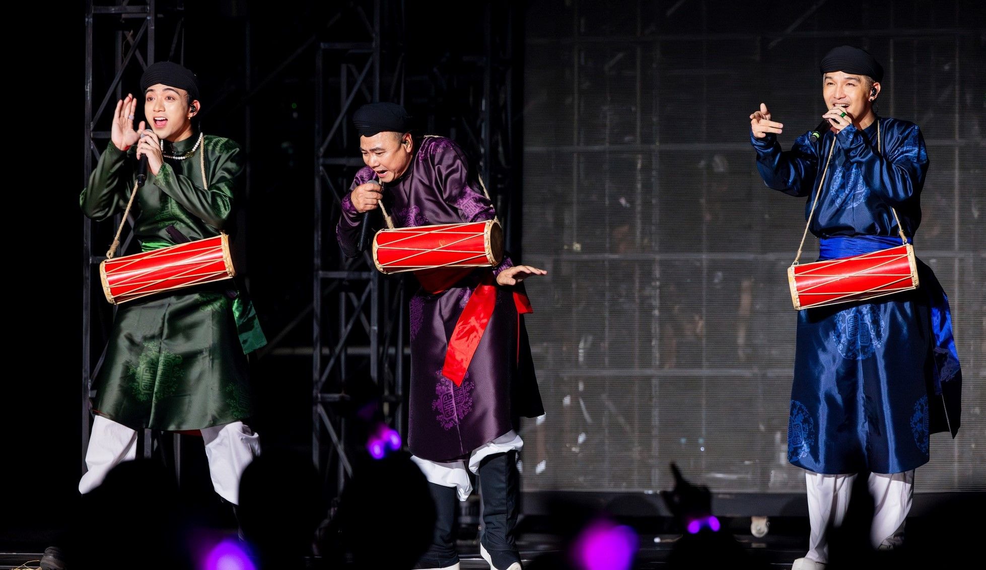 Tiết mục “Trống cơm” do Nghệ sĩ nhân dân Tự Long, ca sĩ Soobin Hoàng Sơn và Cường Seven thể hiện. (Ảnh: Yeah1)