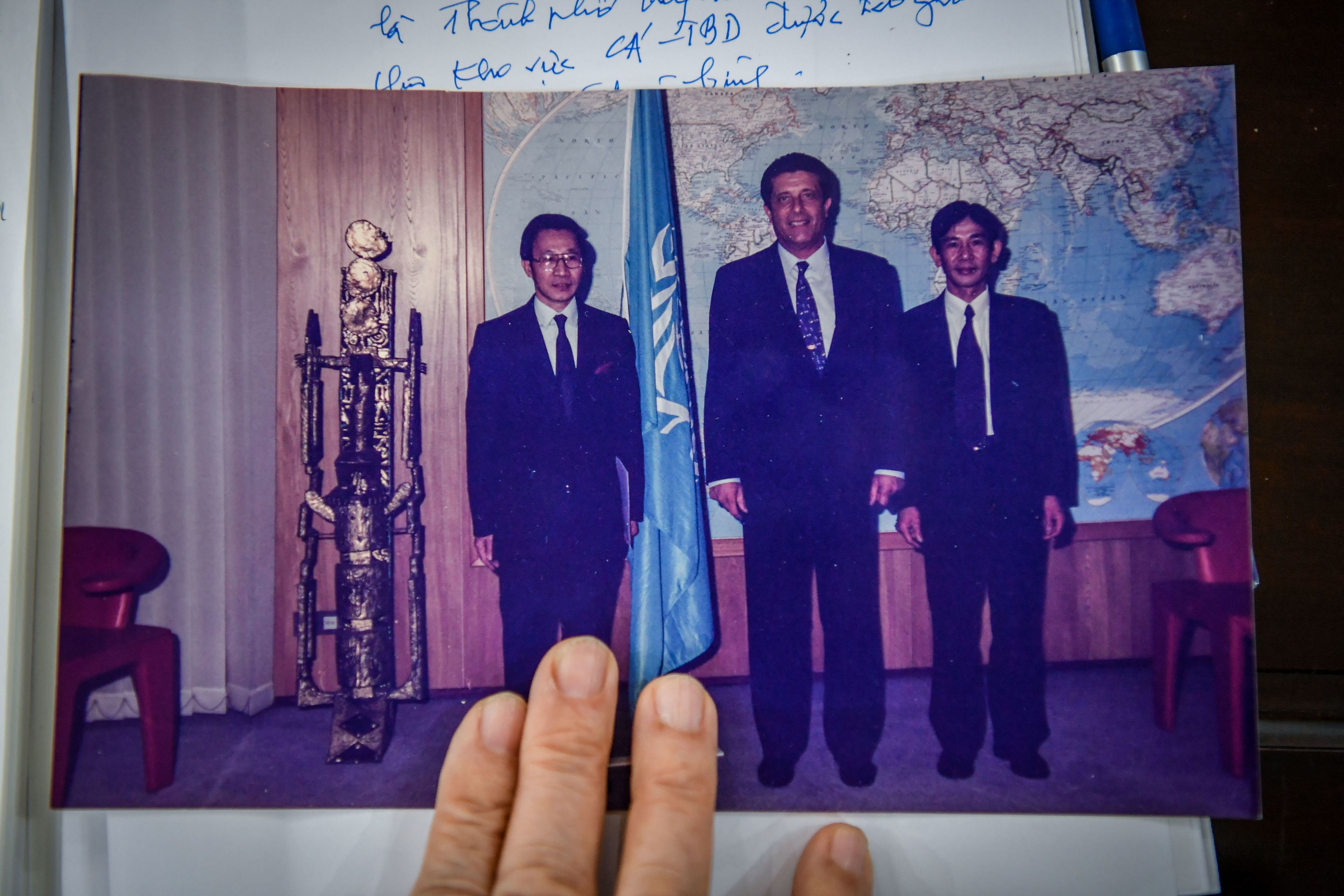 Đại sứ Trịnh Đức Dụ (đeo kính, bên trái) đứng cạnh ngài Federico Mayor - Tổng giám đốc UNESCO giai đoạn 1996-1999. (Ảnh: Nhân vật cung cấp)